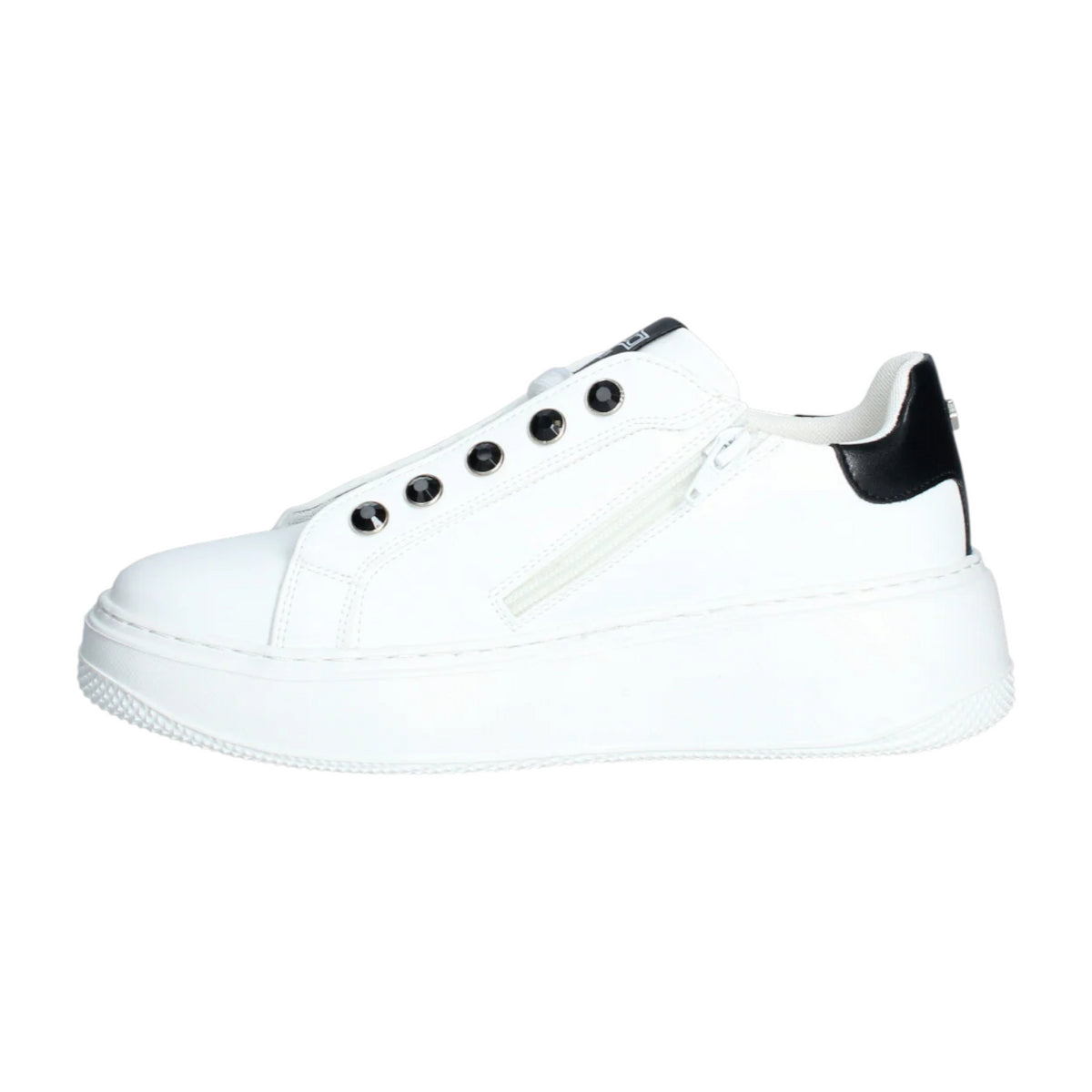 La Sneakers firmata Cult Young, realizzata in ecopelle è caratterizzata da una tomaia bianca e da bordi e strass neri luccicosi, l'interno è foderato in tessuto con comodo plantare in pelle, inoltre la chiusura con lacci e zip assicura una calzata facile.