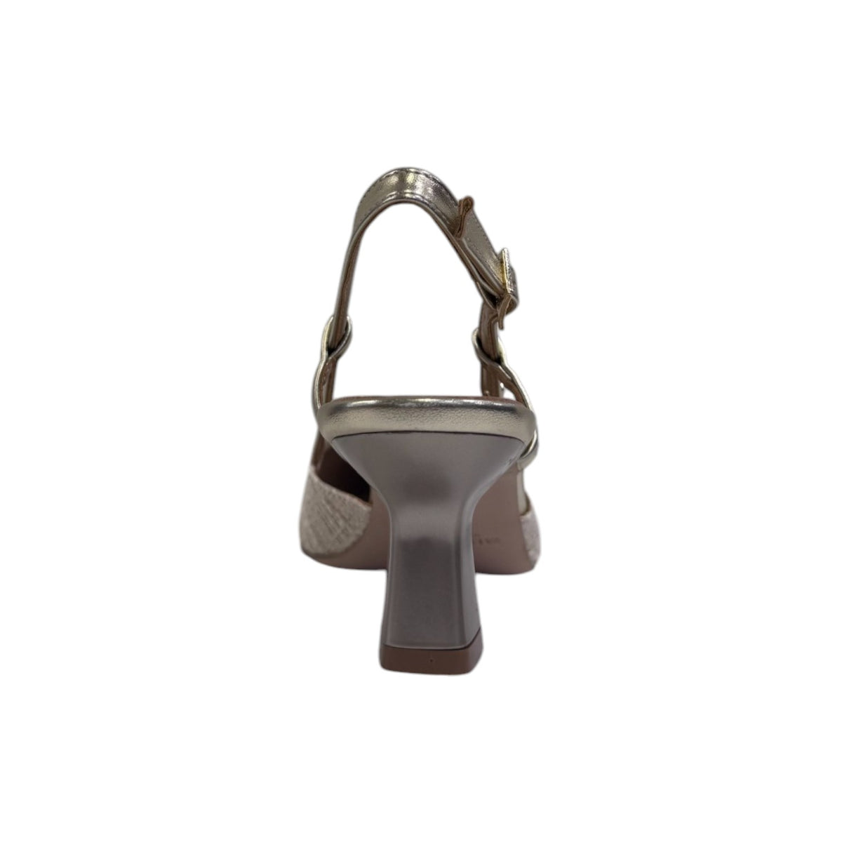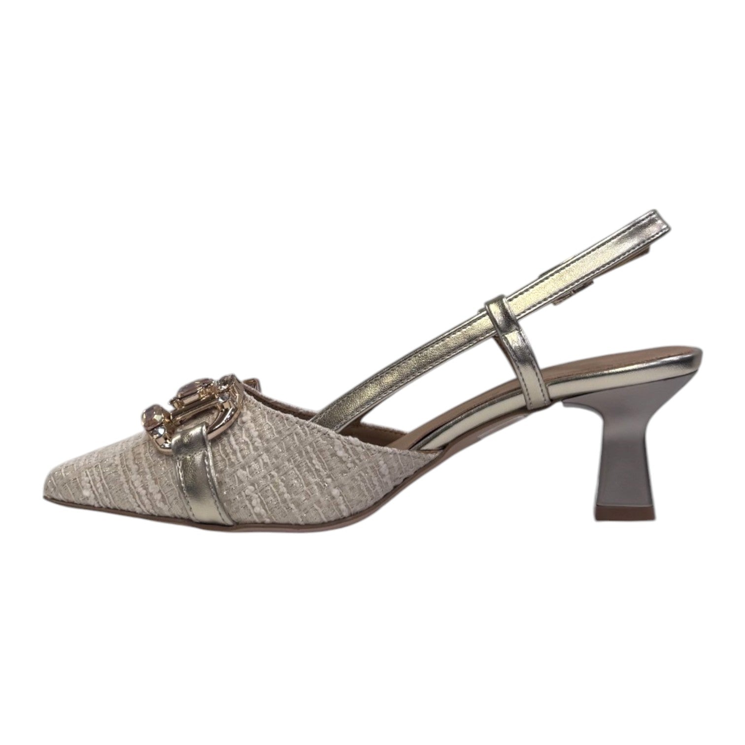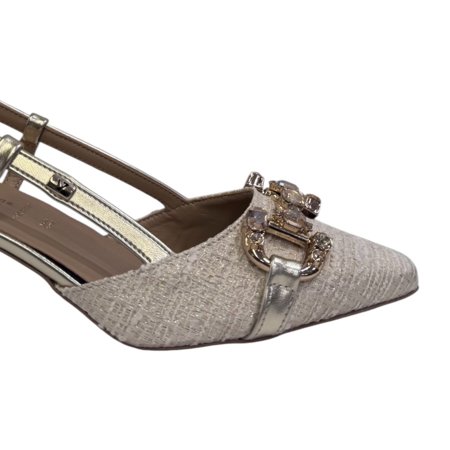 La Chanelle firmata Valleverde, realizzata in tessuto sulla punta ed ecopelle laminata sul cinturino è caratterizzata da morsetto con pietre gioiello e plantare in ecopelle, presenta un comodo tacco a rocchetto laminato di 7cm.