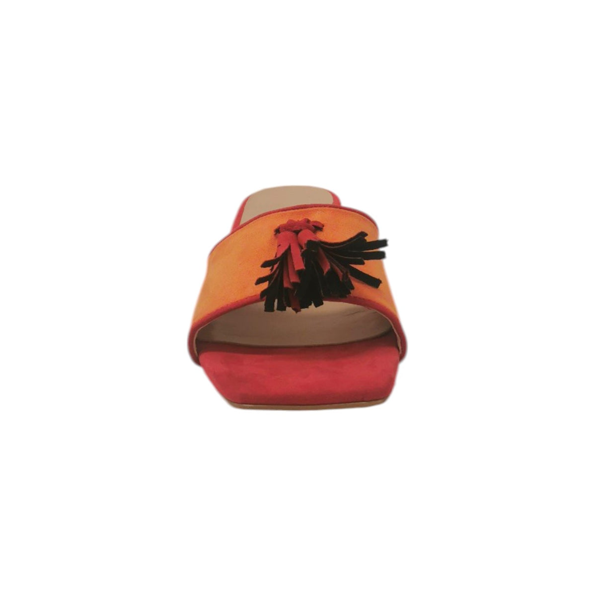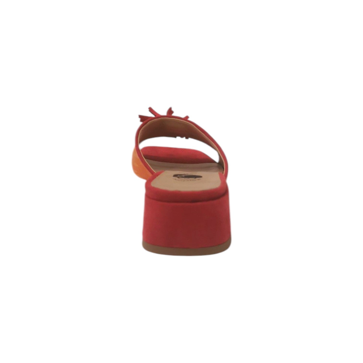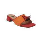 Lo Scalzato firmato Scarpeborseonline, contrasto di colore tra l'arancio e rosso realizzato in camoscio sintetico è caratterizzato da nappine frontali sulla fascia e da interno foderato in ecopelle con sottopiede rivestito in pelle, il tacco largo di 4cm offre un maggior comfort.