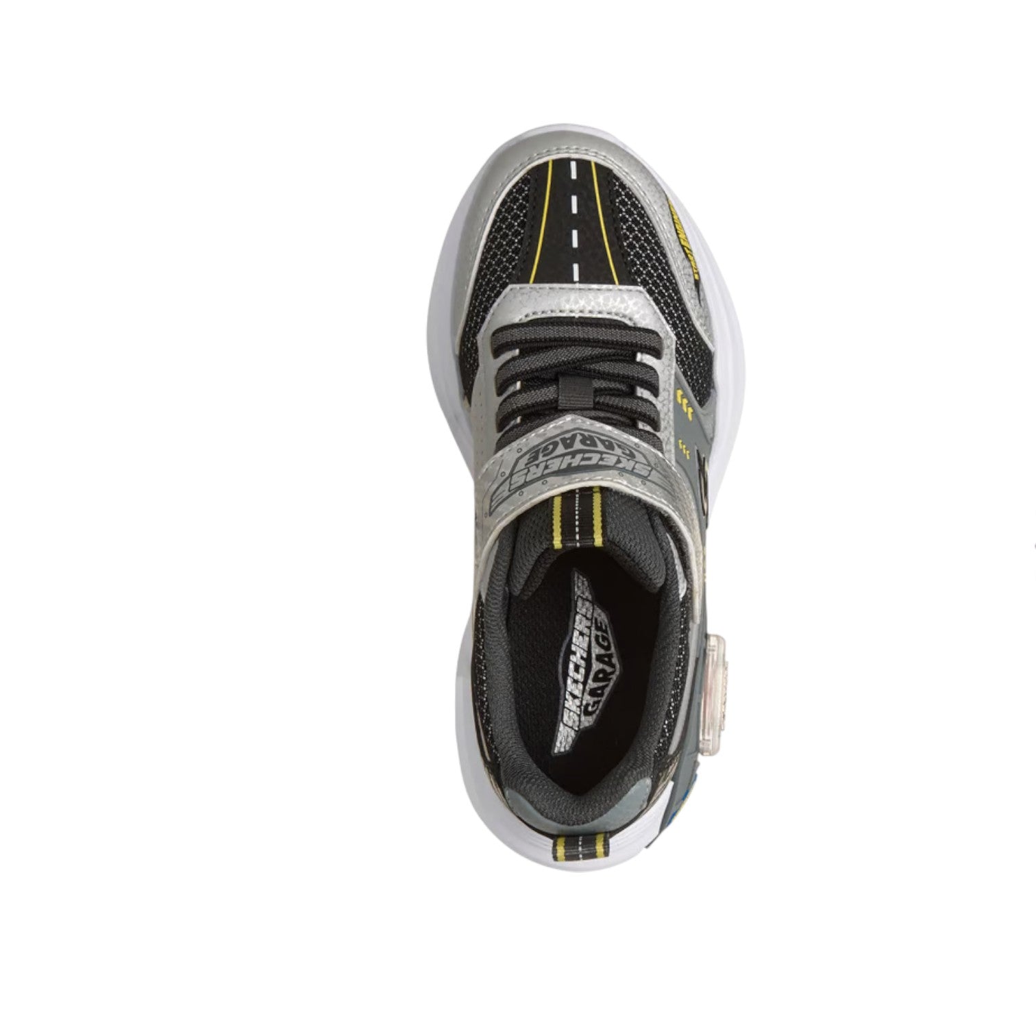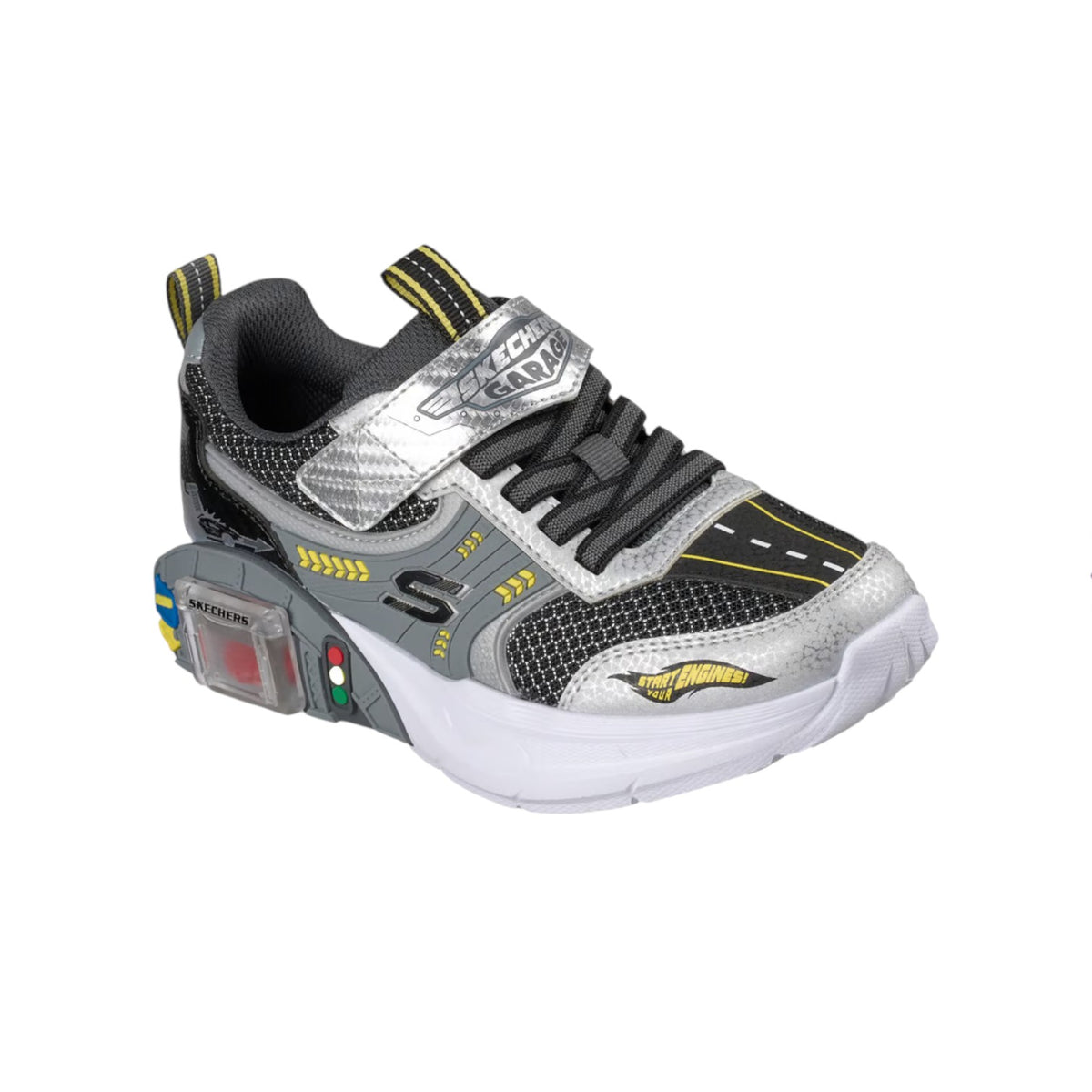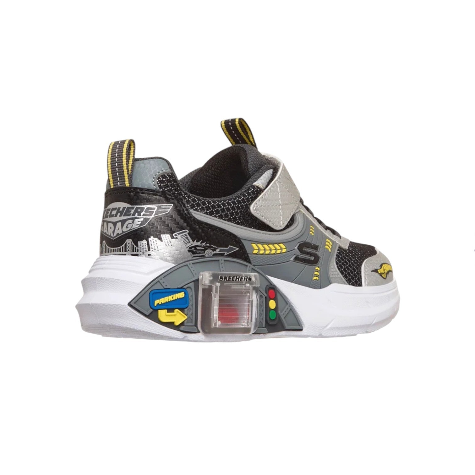La Sneakers firmata Skechers, con chiusura adattiva presenta una tomaia in mesh e rivestimento sintetico con accattivanti grafiche a tema automobilistico, lacci elastici fissi e cinturino regolabile sul collo del piede. Questo design giocoso è completo di un garage scorrevole sull'intersuola e include due macchinine giocattolo che possono essere riposte all'interno!