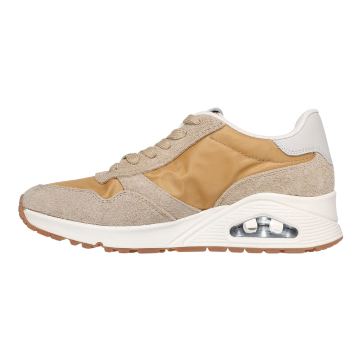 La Sneakers firmata Skechers, modello Uno fashion rétro presenta una tomaia in pelle scamosciata e mesh con allacciatura frontale, soletta Air-Cooled Memory Foam e un’intersuola con ammortizzazione ad aria visibile Skech-Air.