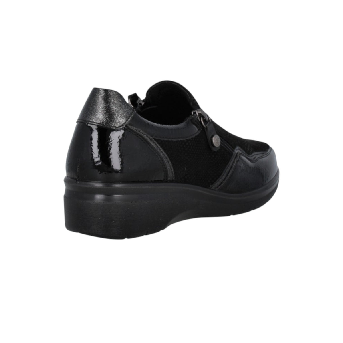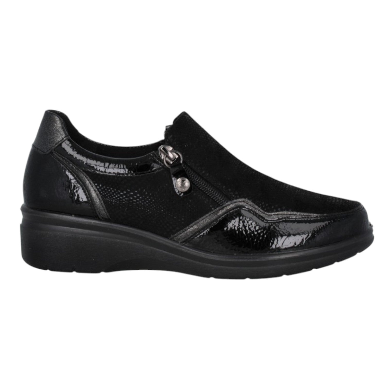 Il Mocassino firmato Amarpies, realizzato in vernice sintetica e tessuto è caratterizzato da due zip laterali per facilitarne la calzata e l'interno è foderato in tessuto con plantare memory estraibile. Dando priorità al benessere del piede, Amarpies utilizza materiali di alta qualità e tecnologie di ammortizzazione nelle sue creazioni, senza trascurare le ultime tendenze della moda.