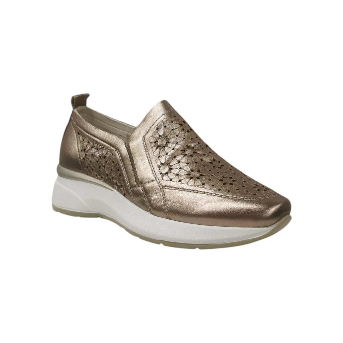 Il Mocassino firmato Susimoda, realizzato in pelle laminata bronzo è dotato di lavorazione traforata floreale e di plantare in morbida pelle estraibile, offre la massima comodità durante la giornata. La suola di 5cm garantisce un'altezza elegante senza compromessi sulla stabilità.
