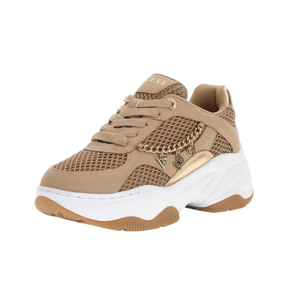 La Sneakers firmata Guess, realizzata in ecopelle e tessuto nella variante avena dispone di inserto laminato e catena con ciondoli logo. Modello accompagnato dalla suola con plateau, lussuose e comode, per un look di tendenza con un tocco di femminilità.