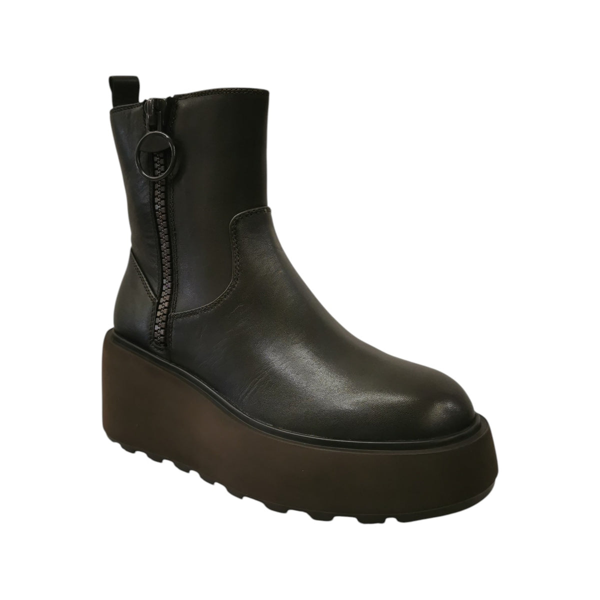 Lo Stivaletto firmato Cafènoir, realizzato in morbida pelle è caratterizzato da doppia zip laterale come chiusura e da fodera in tessuto e sottopiede in pelle con zeppa di 8cm appoggiata su un comodo plateau. Con un design moderno e materiali di alta qualità, questi stivaletti offrono una calzata confortevole e un look versatile.