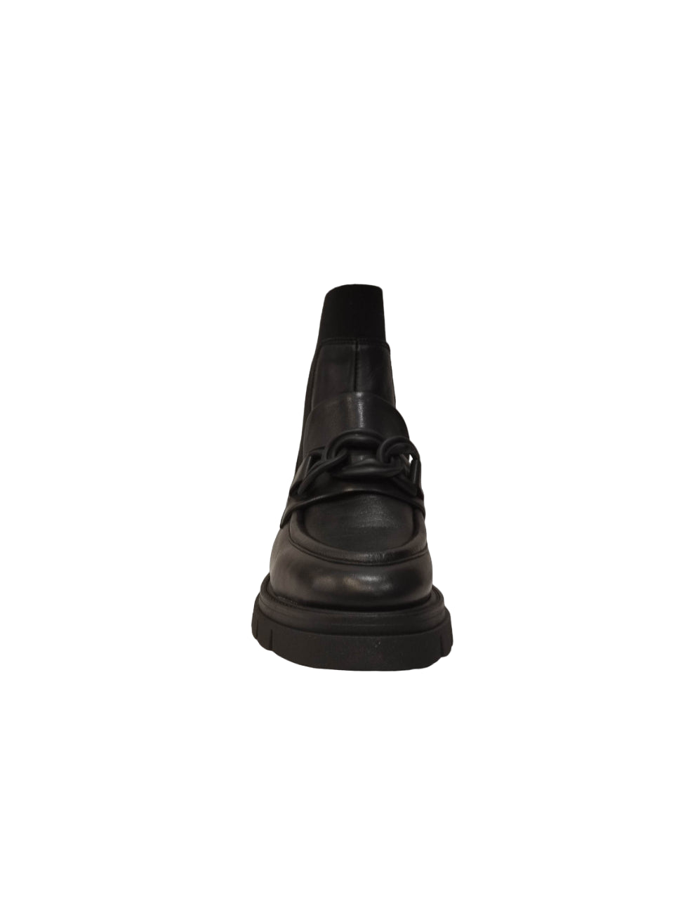 Il Mocassino firmato Laura Bizzarri, realizzato in vera e morbida pelle 'Made in Italy' è caratterizzato da morsetto e catena ed elastico in tessuto lungo tutta la caviglia, con interno e sottopiede foderati in pelle.