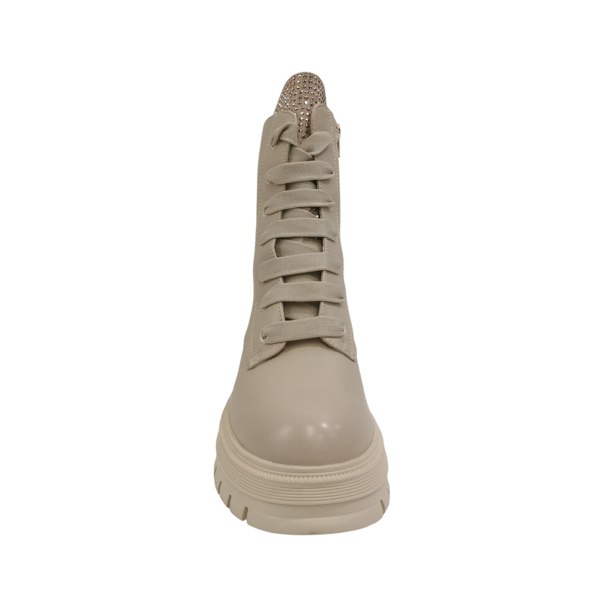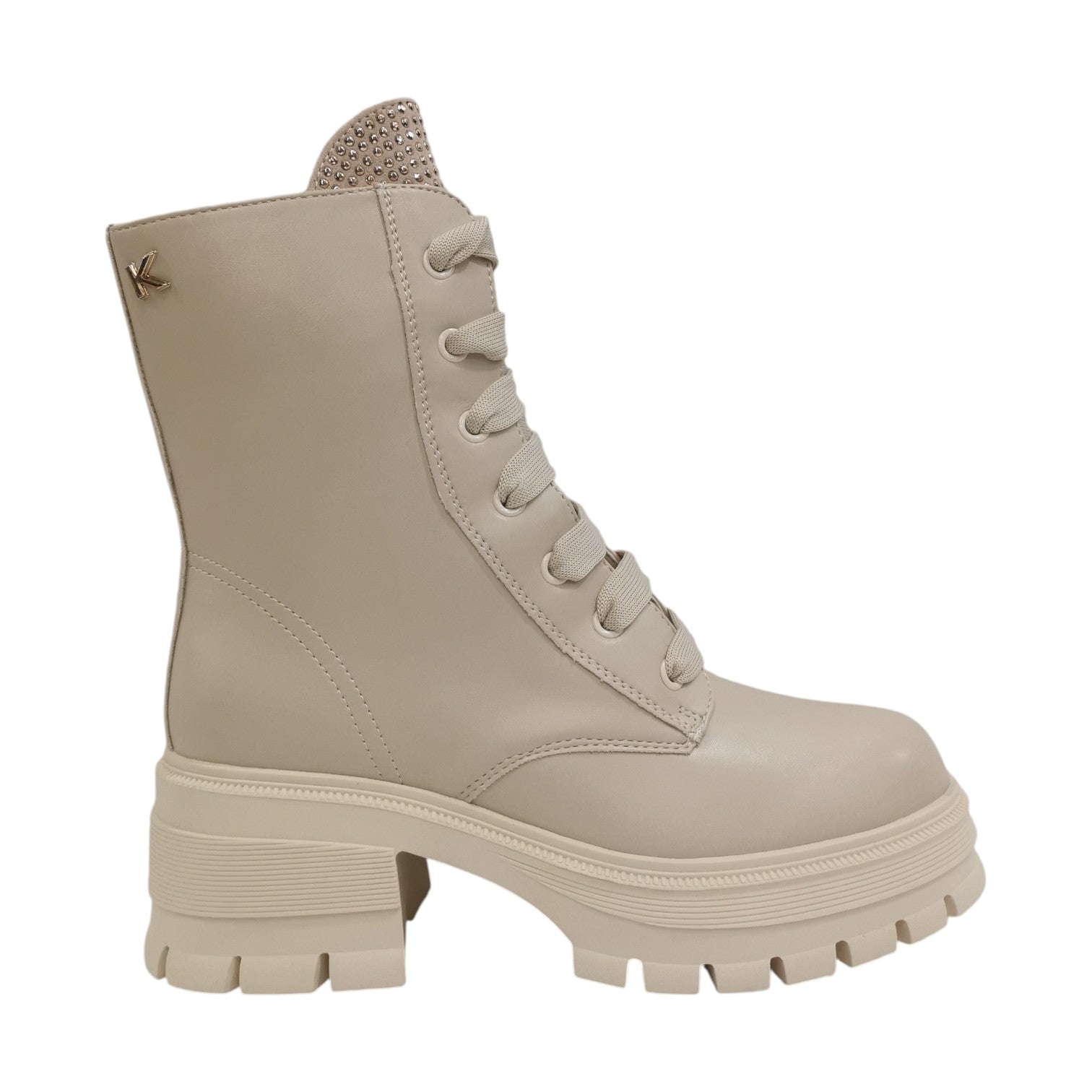 L'Anfibio firmato Keys, realizzato in ecopelle beige è caratterizzato da applicazione di strass neri e da chiusura con lacci e zip per favorirne la calzata, presenta un tacco largo alto 6cm e fodera in tessuto caldo.