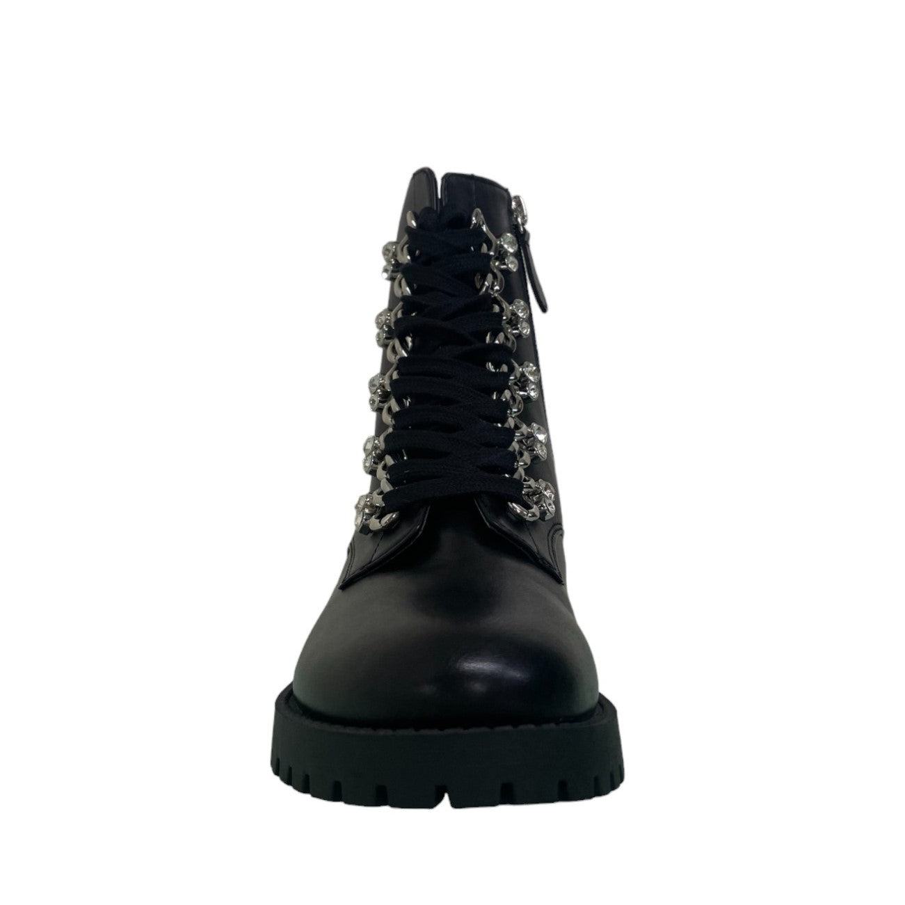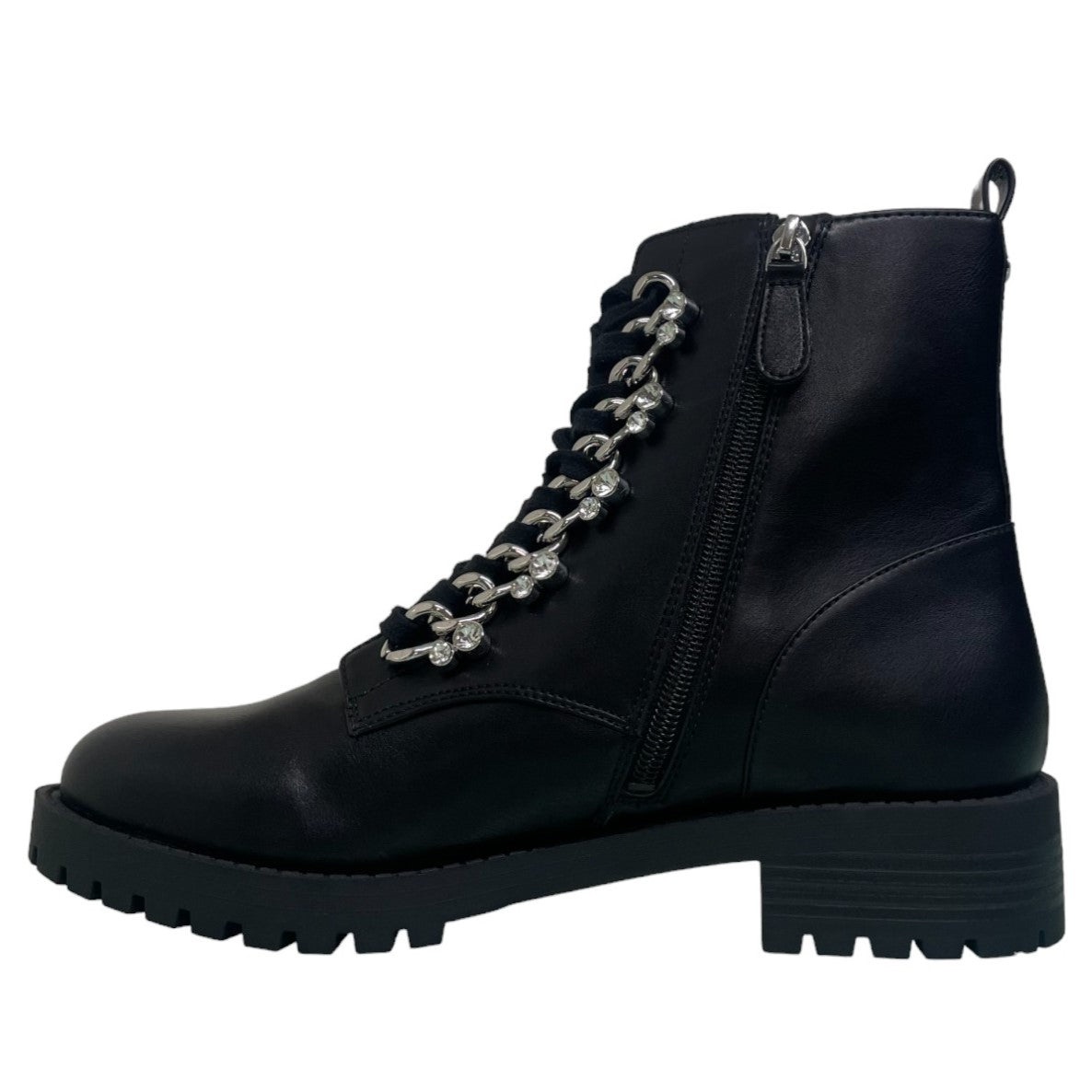 L'Anfibio firmato Guess, realizzato in ecopelle è caratterizzato da occhielli con applicazione catena e strass, e da una comoda chiusura con lacci e zip laterale. Modello internamente foderato in tessuto con morbido sottopiede in ecopelle.