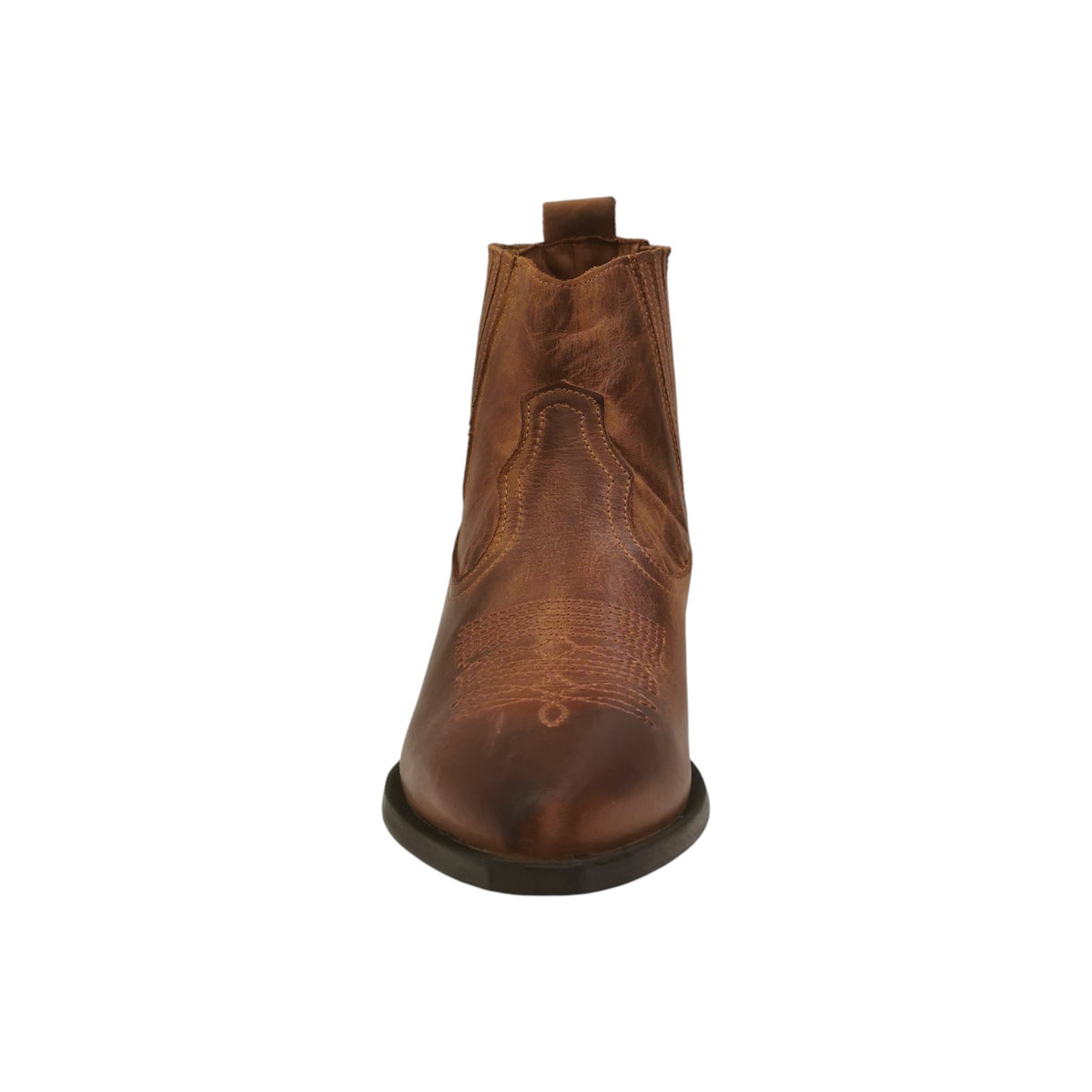 Il Camperos firmato Agua, un prodotto Made in Italy realizzato in pelle nella variante cuoio è caratterizzato da particolare disegno cucito frontale e da una punta sfilata, presenta una linguetta posteriore per facilitarne la calzata e un tacco di 5cm.