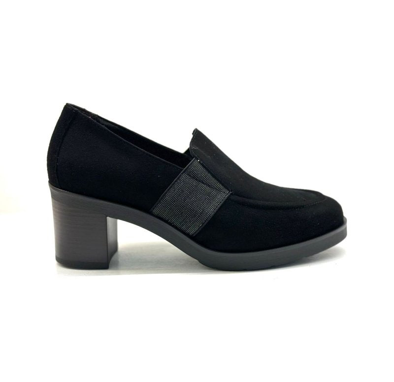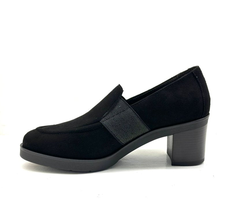Il Mocassino firmato Susimoda, realizzato in camoscio presenta due elastici laterali in tessuto decorati da strass per facilitare la calzata, ed un interno e sottopiede foderati in pelle con comodo tacco alto 5cm.