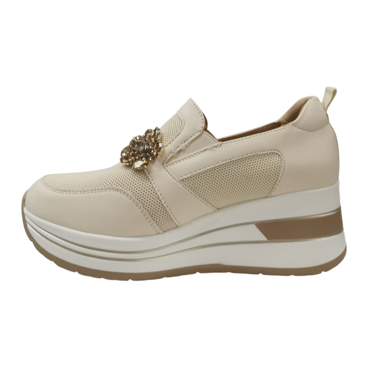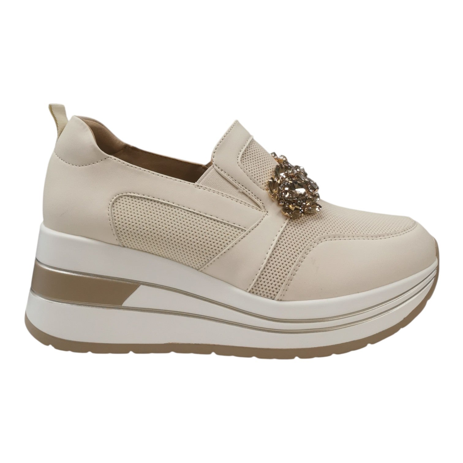 Il Mocassino firmato Susimoda, realizzato in ecopelle qui proposta nella variante burro è caratterizzato da inserti in tessuto e da bellissimo dettaglio gioiello, e da morbido plantare in pelle estraibile, con zeppa alta 7cm.