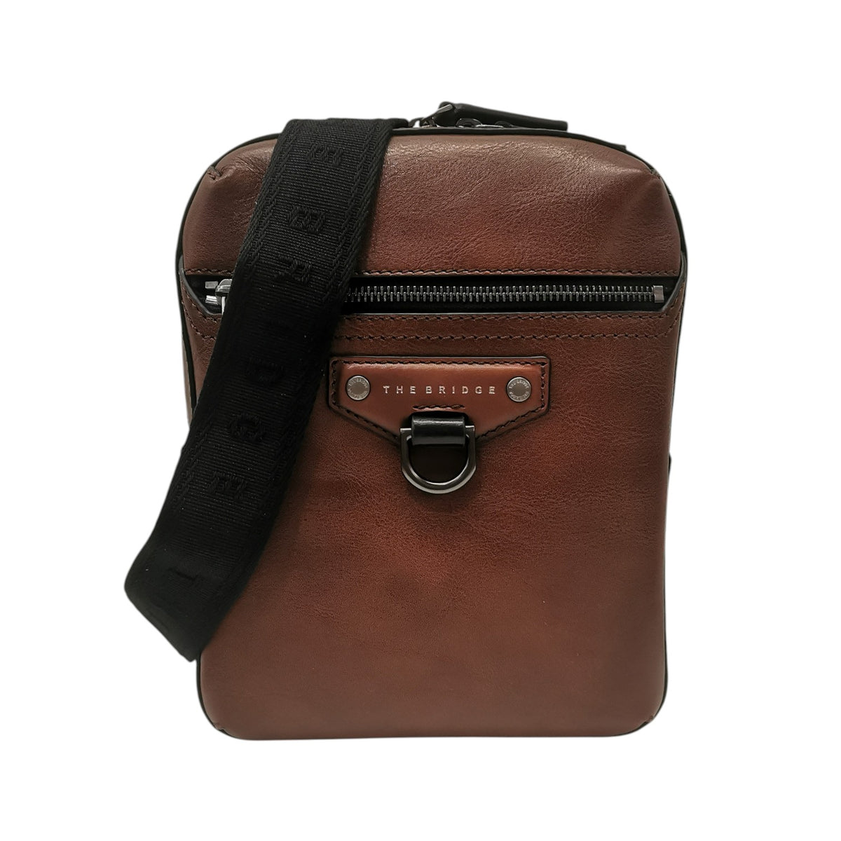 Il Borsello firmato The Bridge, della Linea Iacopo realizzato modello in pellame liscio è caratterizzato da anello decorativo e da tasca frontale con zip. presenta una tracolla a nastro logato regolabile, scomparto con cerniera, ed interno foderato completo di tasca porta tablet.