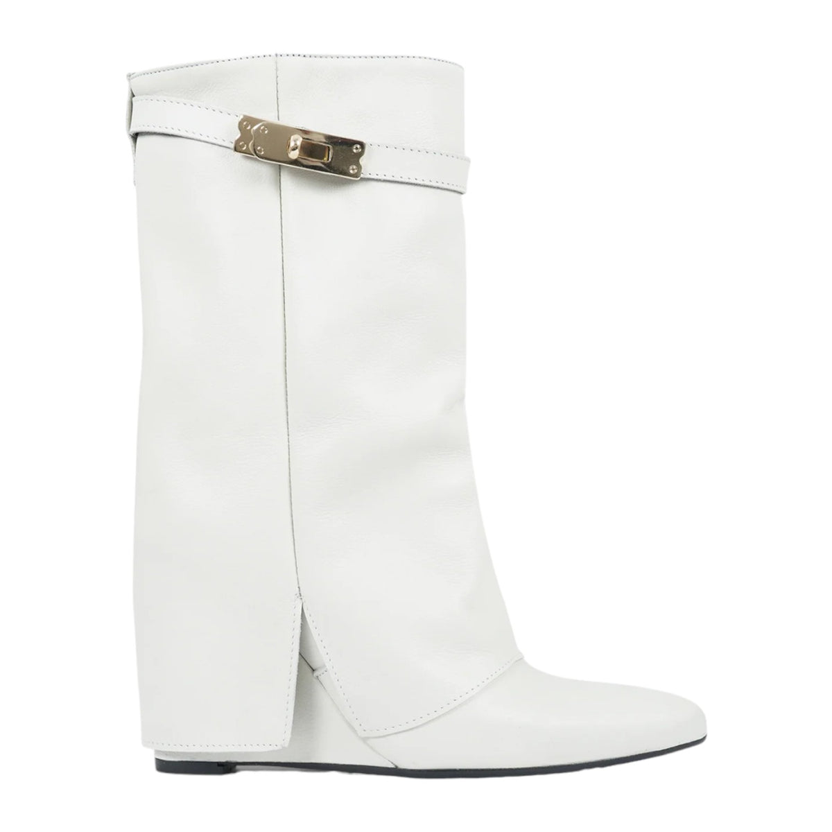 Lo Stivale firmato The Icona, un iconico modello realizzato in pelle è caratterizzato da maxi risvolti e zeppa alta 10cm, inoltre dispone di ganci a forma di lucchetto sul gambale e da comodo interno foderato in tessuto.
