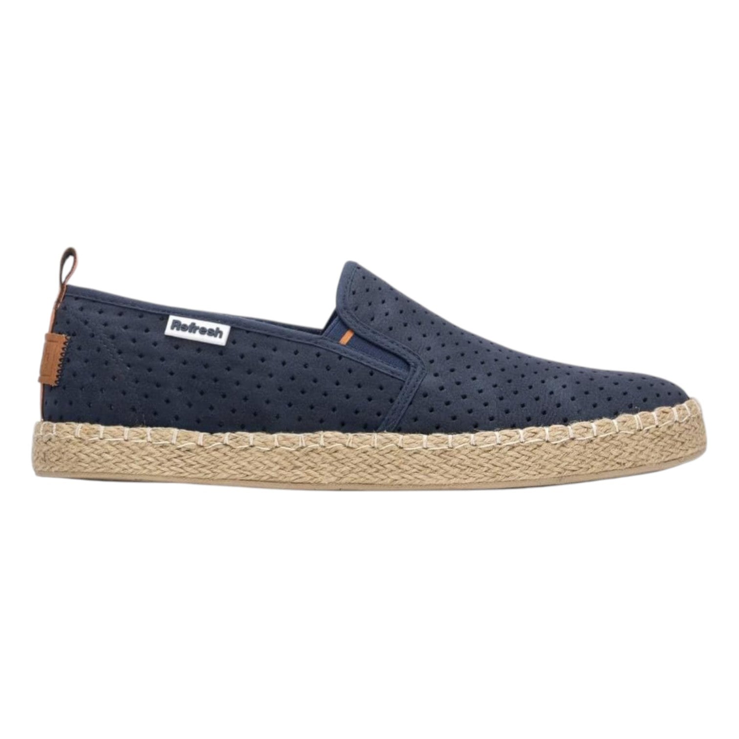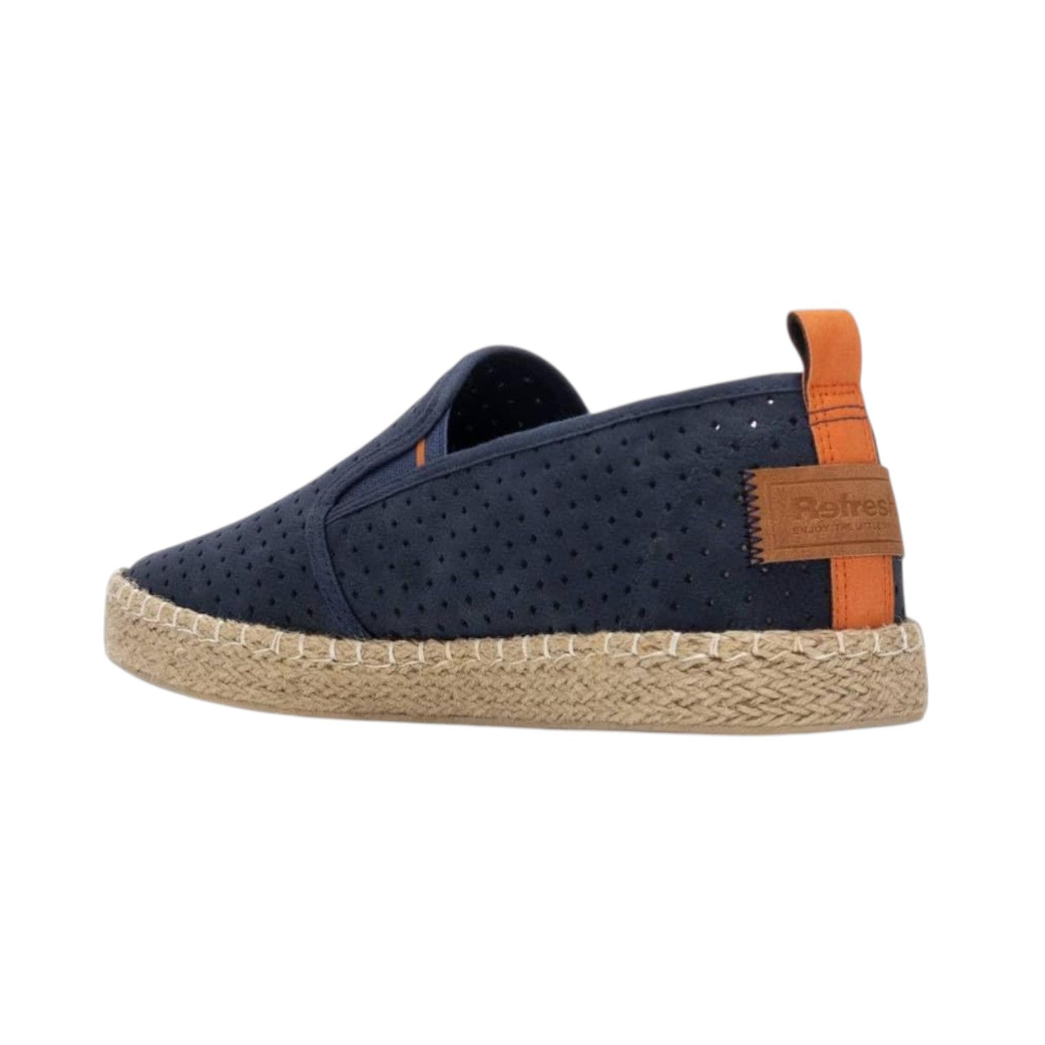 Espadrillas firmata Refresh, realizzata in ecopelle qui proposta nella variante blu è caratterizzata da una lavorazione traforata e da elastici laterali per favorirne la calzata, l'interno è foderato in ecopelle con morbido plantare estraibile memory in tessuto.