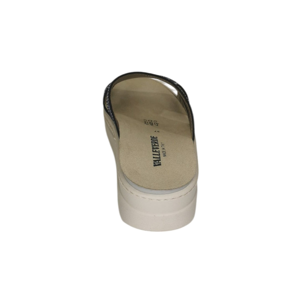 La Ciabatta firmata Valleverde, realizzata in ecopelle rifinita da strass lungo la tomaia, è pensato per donare un twist grintoso ai look quotidiani della bella stagione, il plantare è rivestito in pelle estraibile, inoltre presenta una comoda zeppetta in gomma.