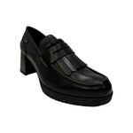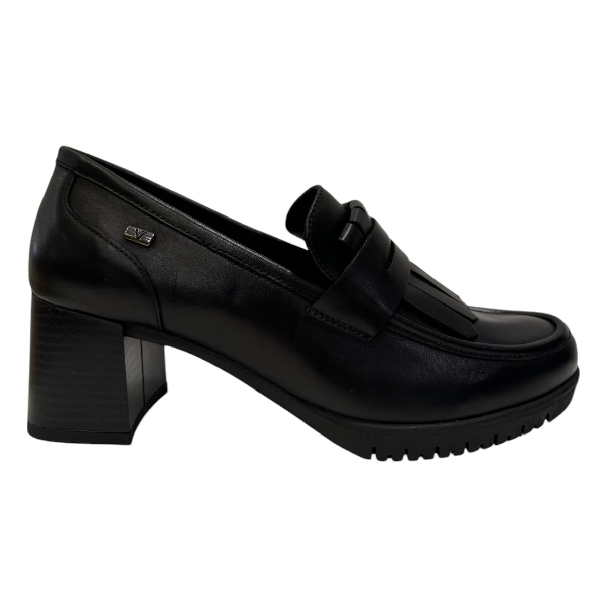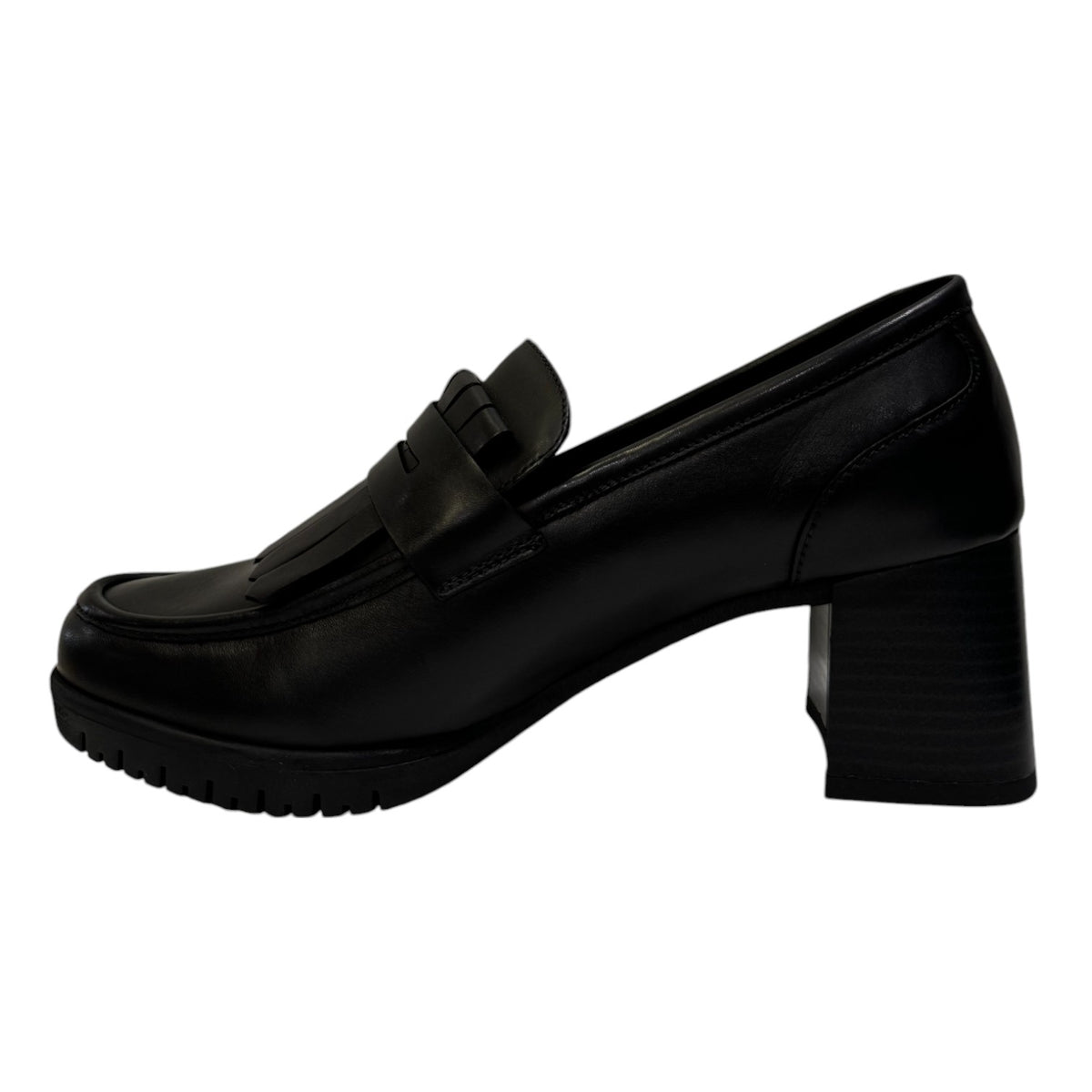 Il Mocassino firmato Valleverde, realizzato in pelle è caratterizzato da elastici in tessuto laterali per favorire la calzata e da frange frontali, l'interno e il sottopiede in pelle garantiscono comfort, inoltre dispone di tacco largo alto 6cm.