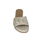 Lo Scalzato firmato Valleverde, qui proposto nella variante crema è caratterizzato da accessorio con catena sulla fascia frontale e da comodo plantare imbottito foderato in pelle, inoltre presenta un comodo tacchetto di 4cm effetto legno.