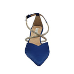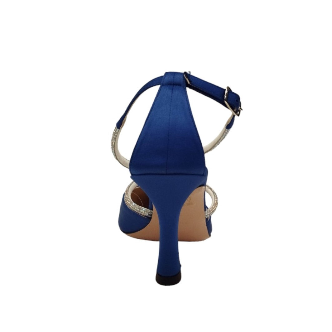 La Chanelle firmata Victoria Chris, realizzata in pelle scamosciata dispone di due fascette incrociate sul collo del piede, ricoperte di micro strass argento. È dotata di un cinturino regolabile alla caviglia e presenta un tacco alto di 8cm per un comodo utilizzo.