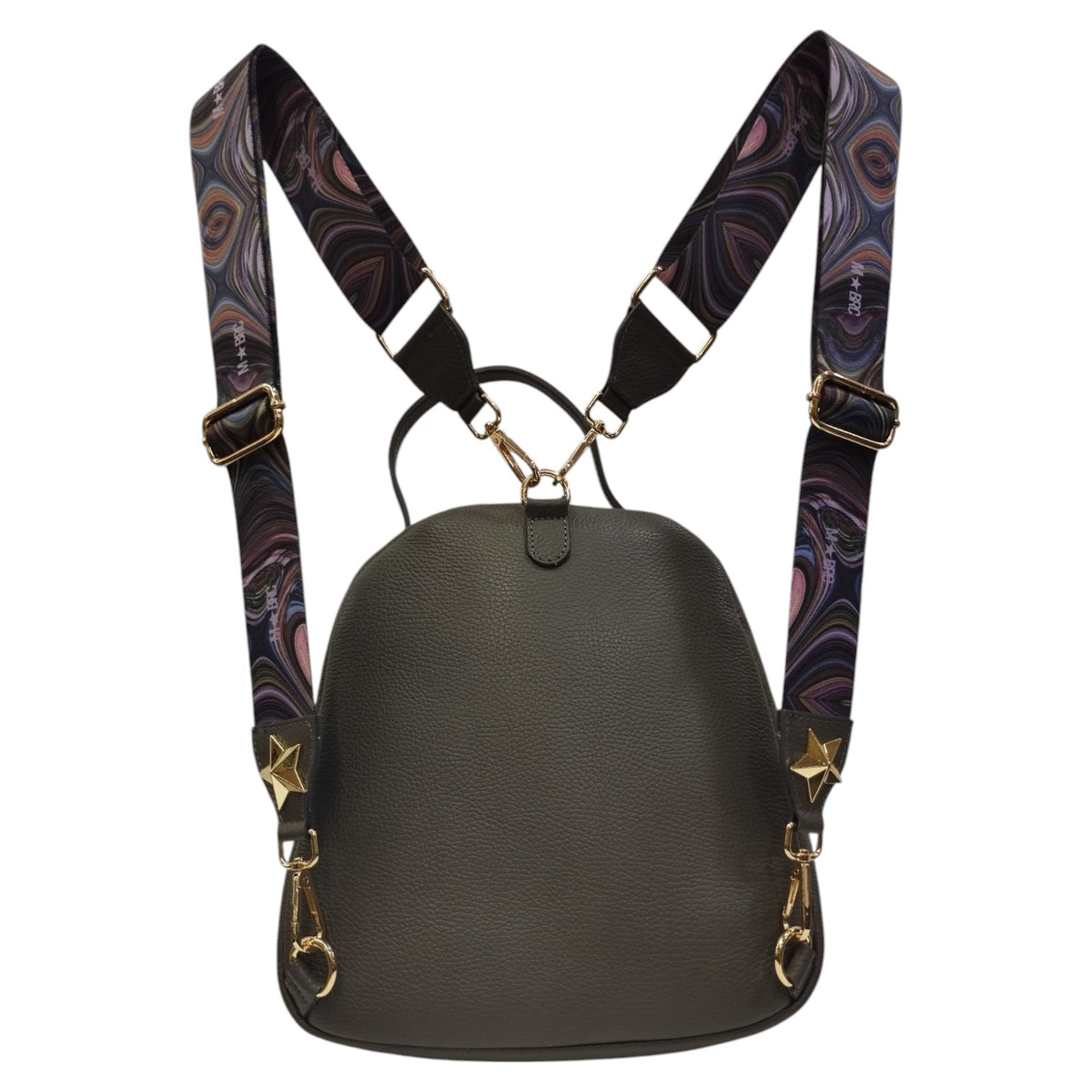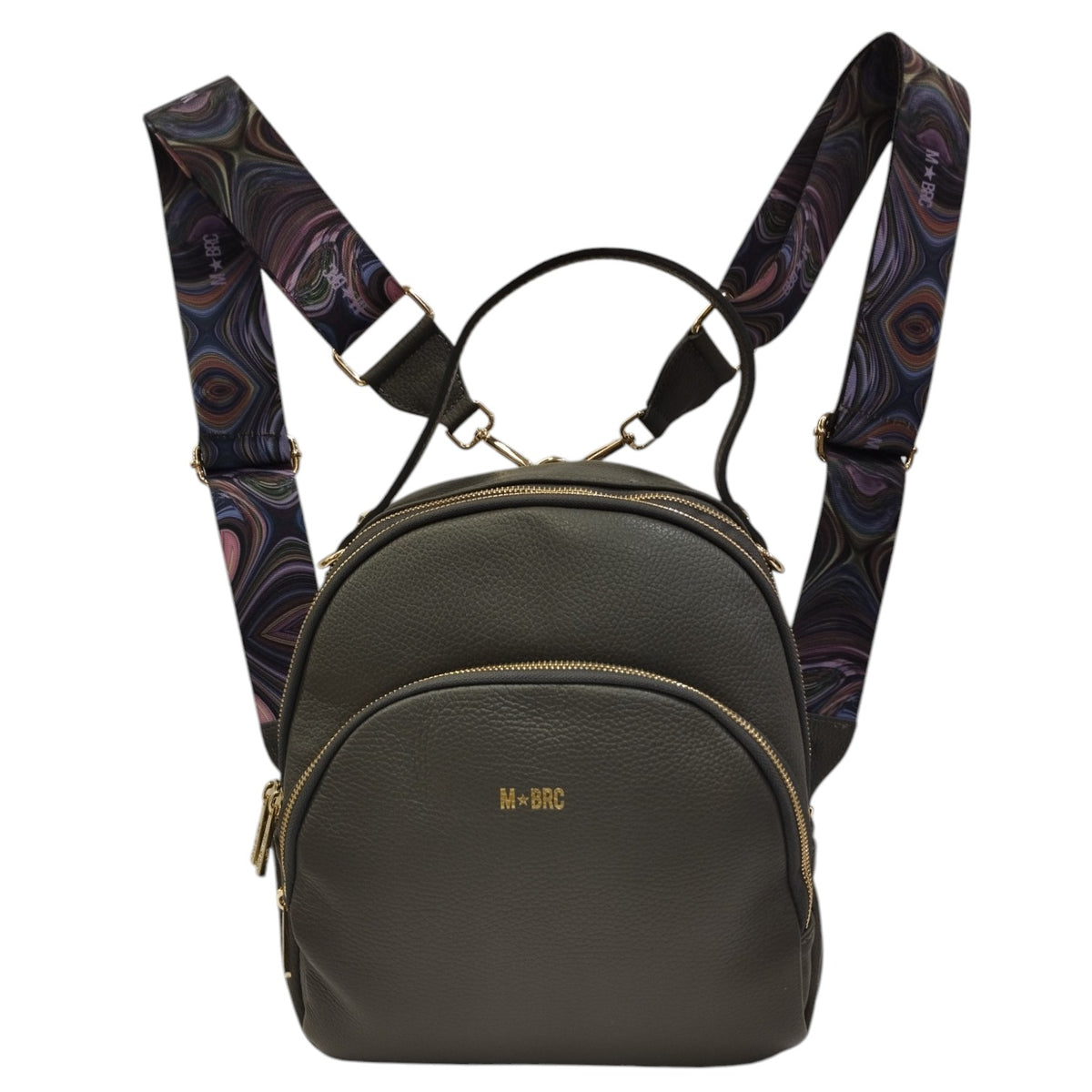 Lo Zaino firmato M Brc, realizzato in pelle martellata della Linea Obona look intramontabile con un design moderno ed audace è caratterizzato da spallacci in tessuto a fantasia regolabili e da interno foderato in tessuto con la presenza di 2 scomparti con tasche porta oggetti di cui 1 tasca con zip, 1 tasca esterna.