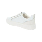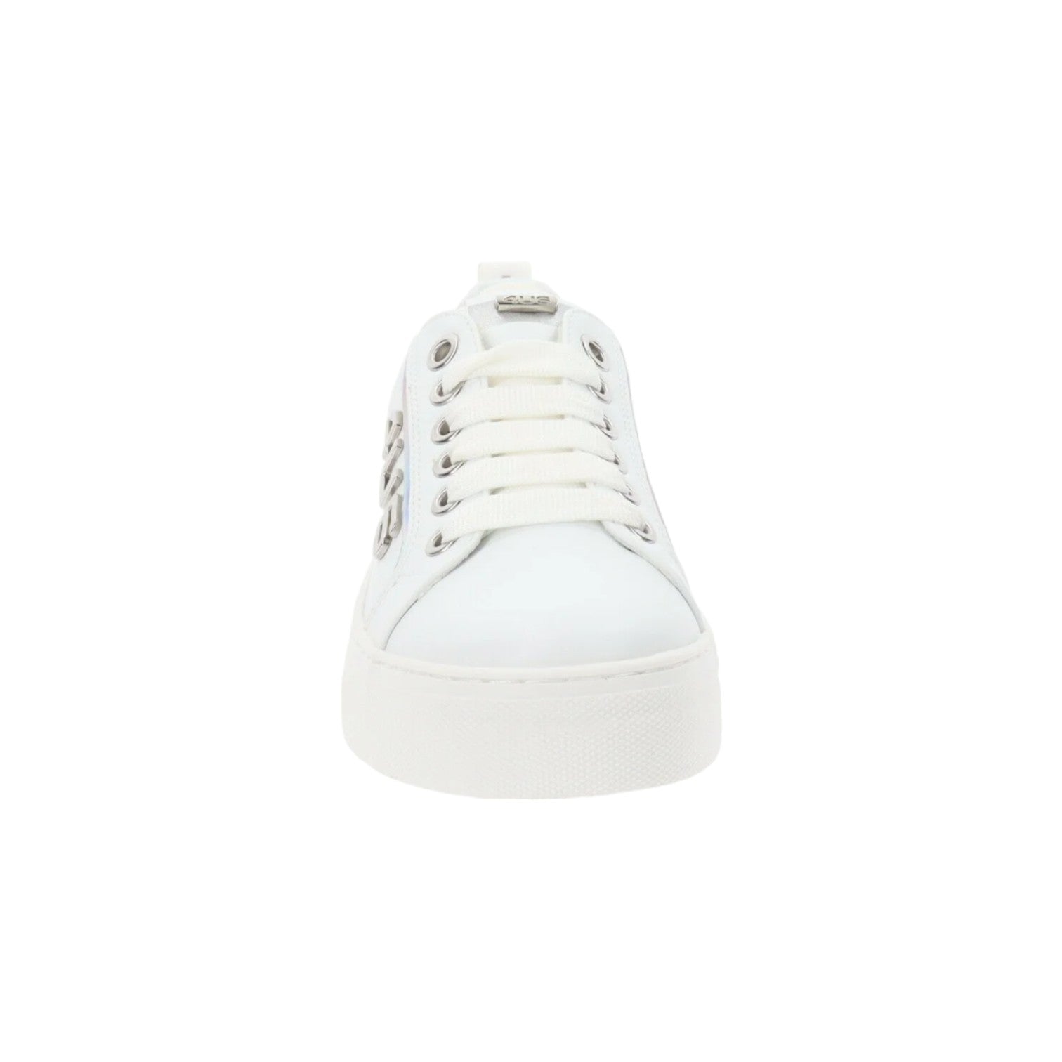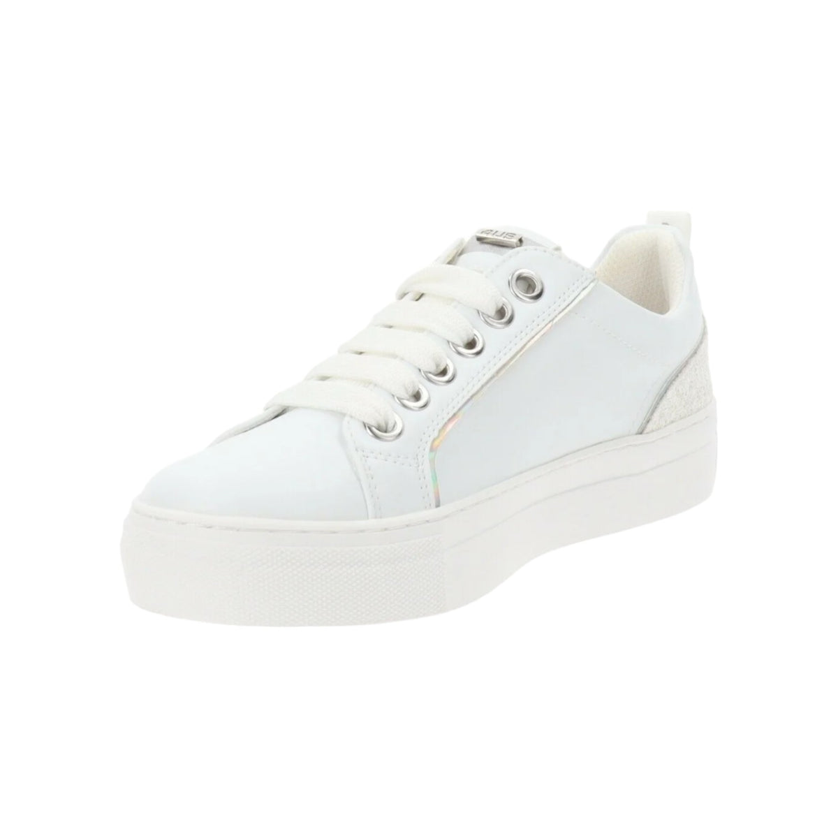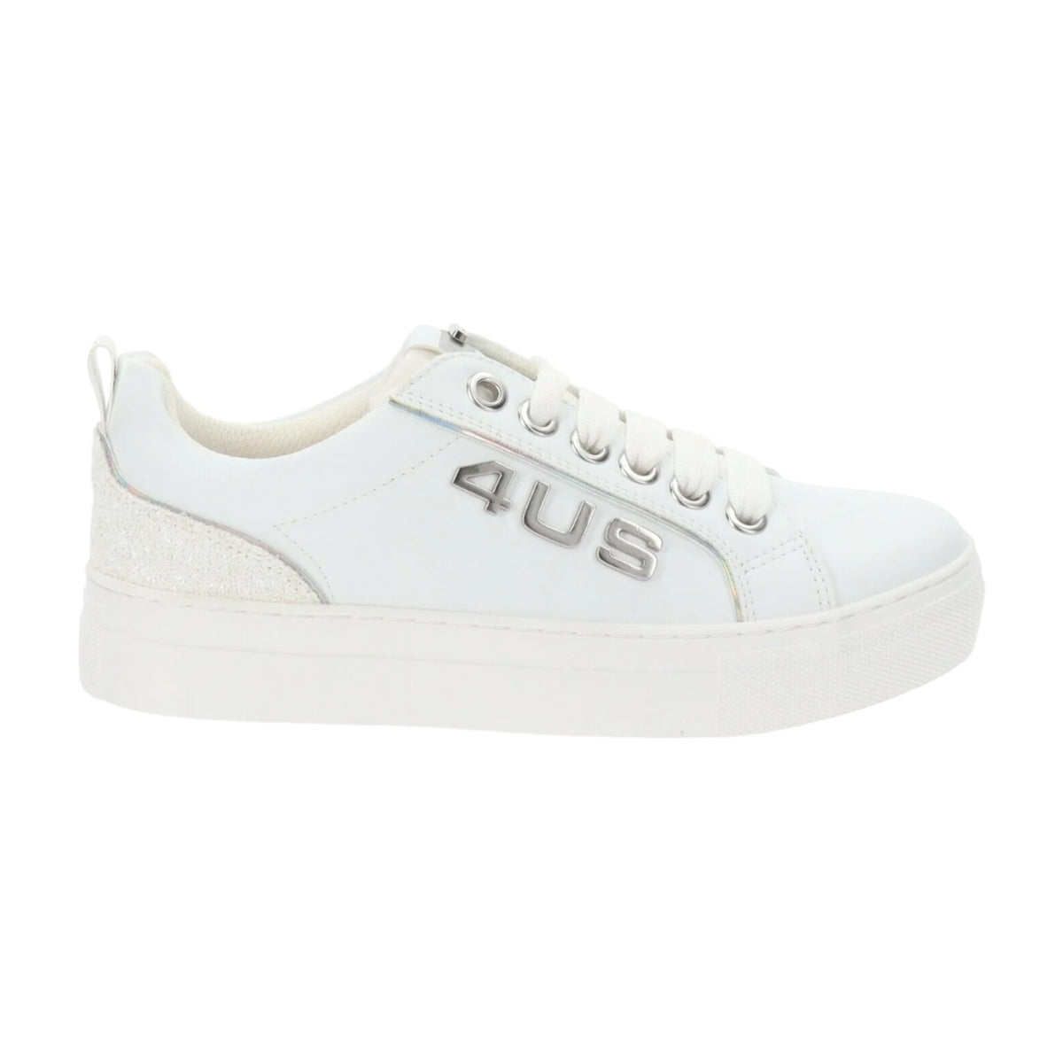 La Sneakers firmata 4US by Paciotti, realizzata in ecopelle bianca è caratterizzata da dettaglio glitterato sul tallone e da comoda chiusura con lacci e zip laterale, mentre l'interno è foderato in tessuto con sottopiede in pelle.