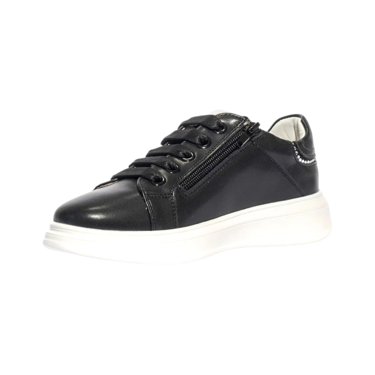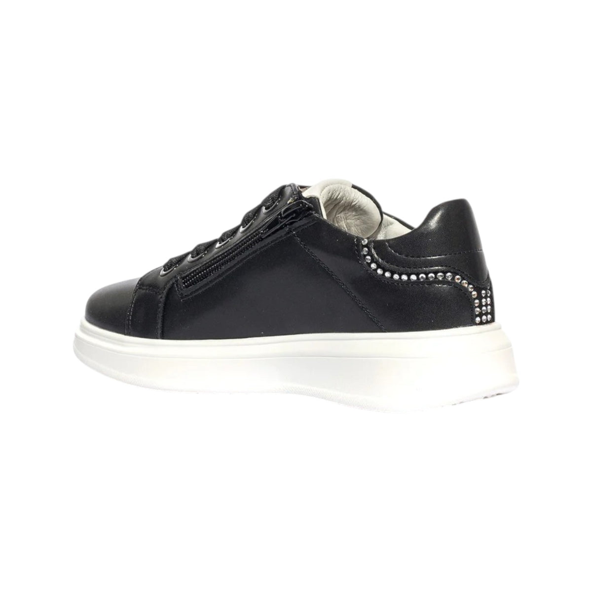 La Sneakers firmata 4us by Paciotti, realizzata in ecopelle nella variante nera è caratterizzata da brillantini decorativi che danno una silhouette elegante. Il logo in rilievo sul lato esterno e i lacci logati, rendono questa scarpa un must have. Chiusura con lacci e cerniera laterale.