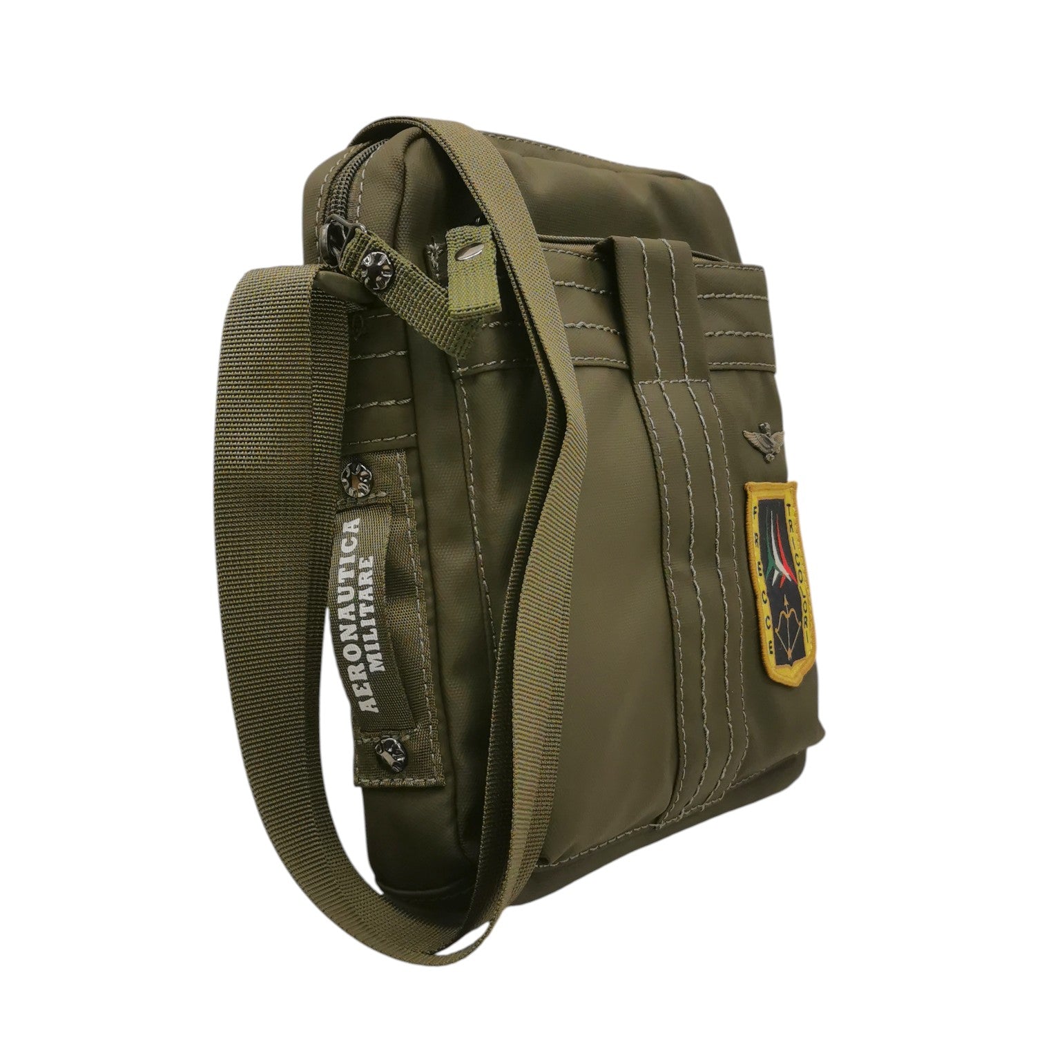 Il Borsello firmato Aeronautica Militare, realizzato in tessuto verde è caratterizzato da tracolla regolabile e taschino con zip internamente e scomparto porta tablet o iPad. Il prodotto è caratterizzato ulteriormente dal fregio delle Frecce Tricolori e dal portachiavi rimovibile “Remove before flight”.