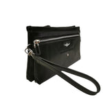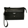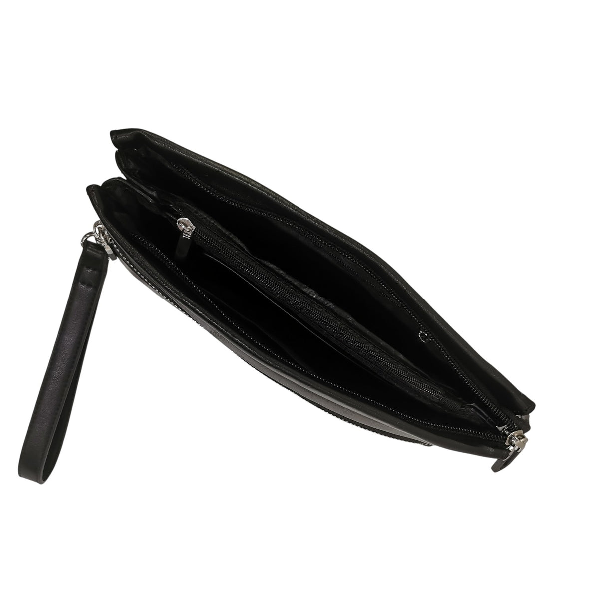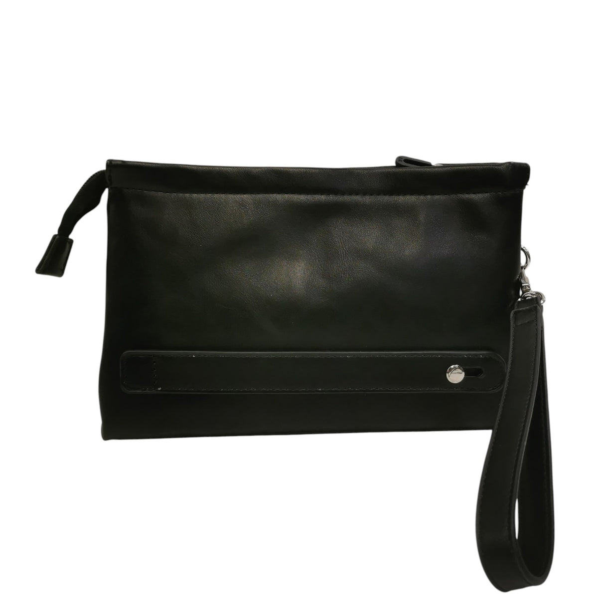 La Pochette firmato Aeronautica Militare, realizzato in ecopelle nera pratica con tasca e logo frontale, polsiera removibile e fascetta posteriore. Interno foderato e organizzato in tre sezioni separate.