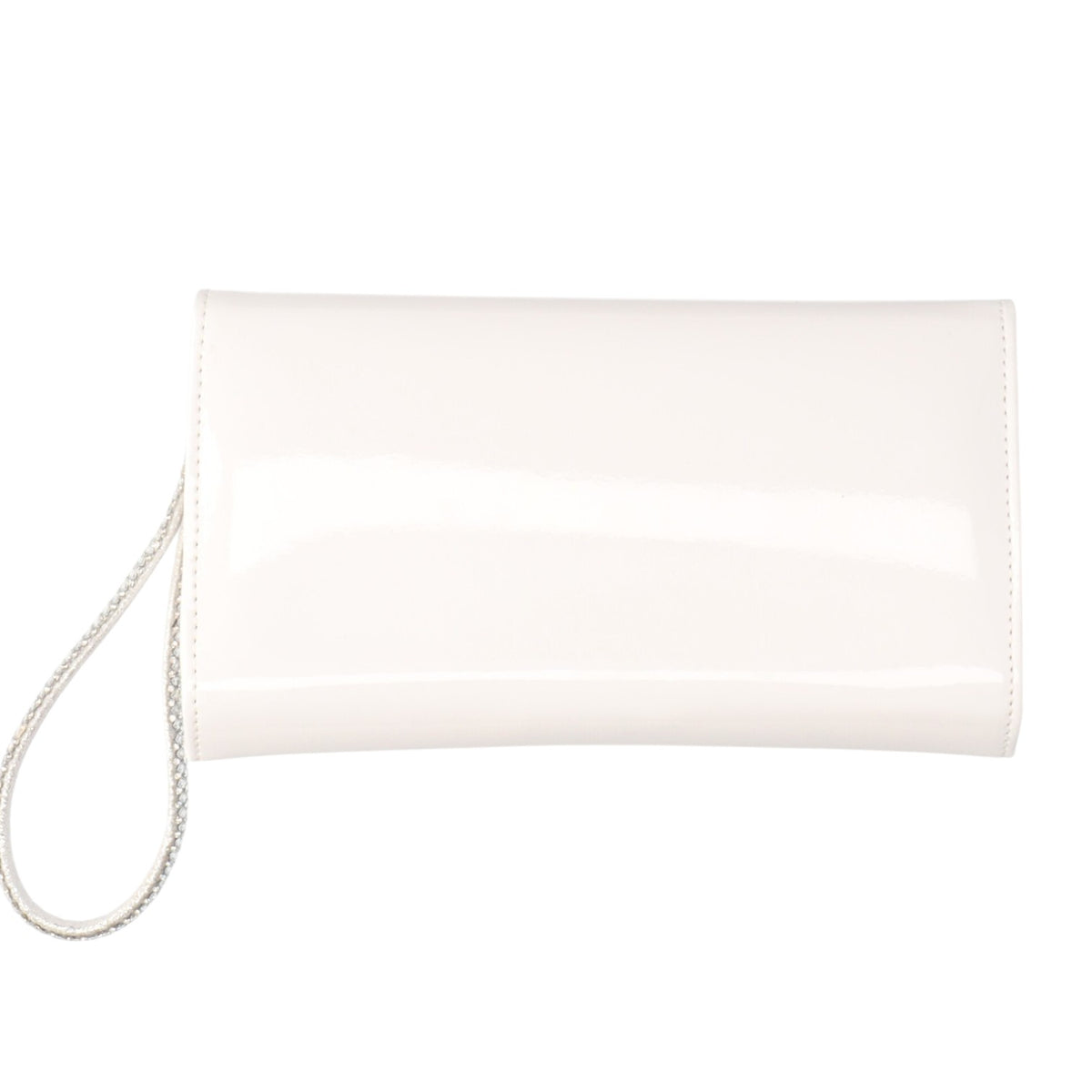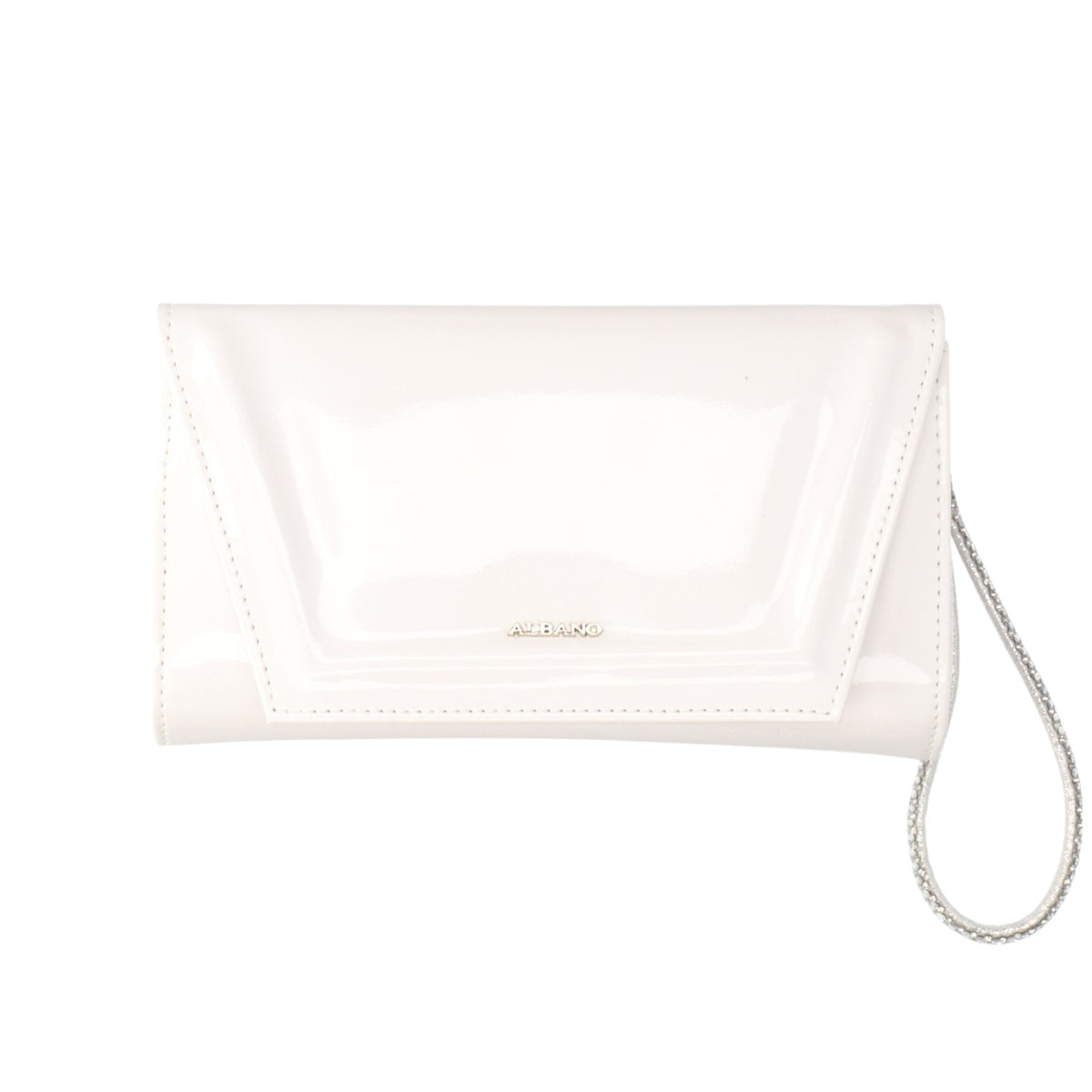 La Pochette firmata Albano, realizzata in vernice bianca all'interno è presente un ampio scomparto foderato in tessuto. Doppia portabilità, a mano, grazie alla polsiera removibile decorata in micro strass, oppure a spalla tramite la tracolla in metallo in dotazione. Chiusura con patta dotata di clip magnetica.