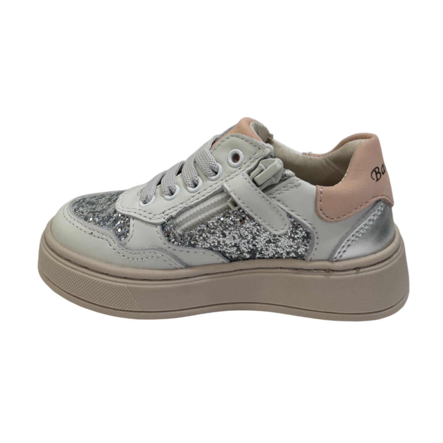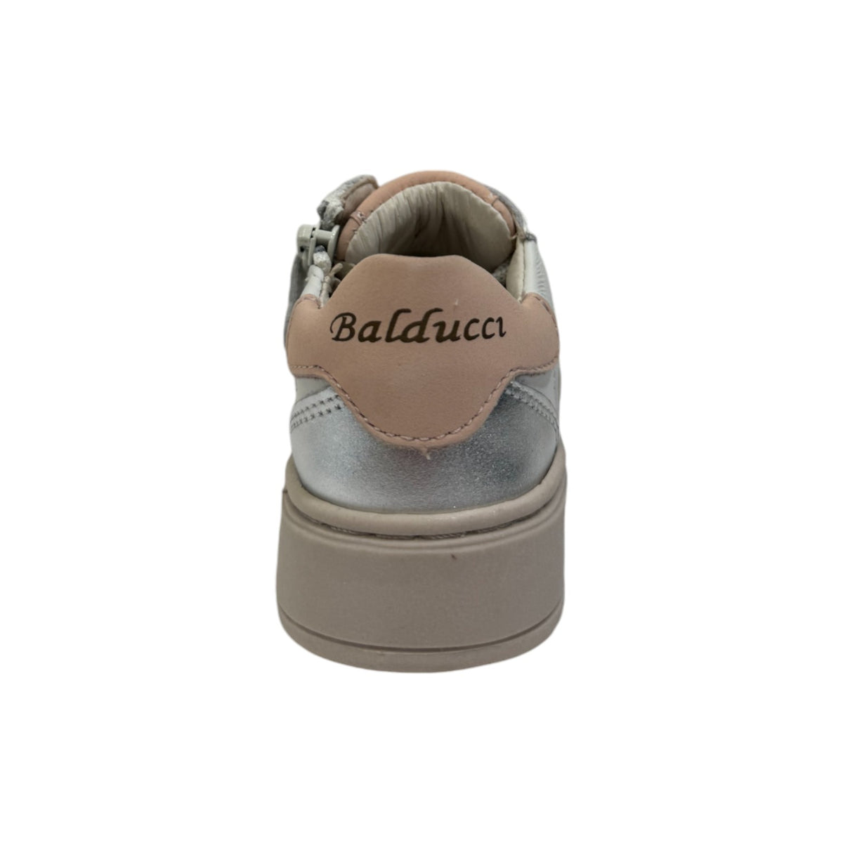 La Sneakers firmata Balducci, realizzata in pelle qui proposta nella variante bianca è caratterizzata da inserti rosa e argento e da applicazione di strass, inoltre presenta una comoda chiusura con lacci e zip laterale, l'interno ed il sottopiede estraibile sono foderati in pelle.