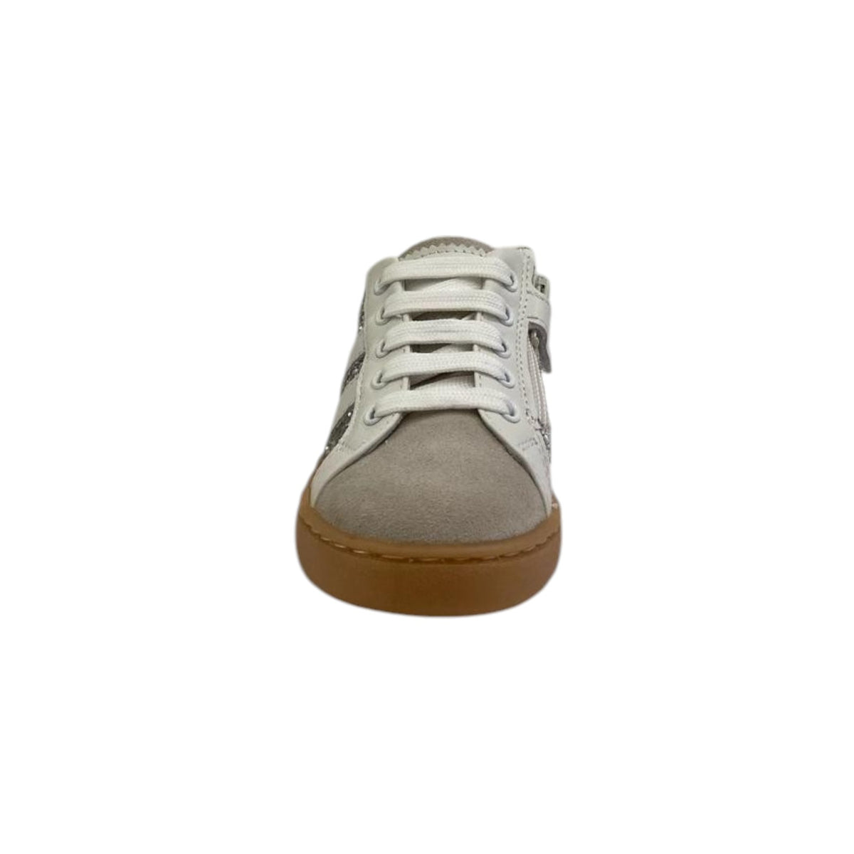 La Sneakers firmata Balducci, realizzata in pelle con punta in camoscio qui proposta nella variante bianca argento è caratterizzata da una applicazione di strass e da una comoda chiusura di lacci e zip laterale, l'interno ed il sottopiede estraibile sono foderati in pelle.
