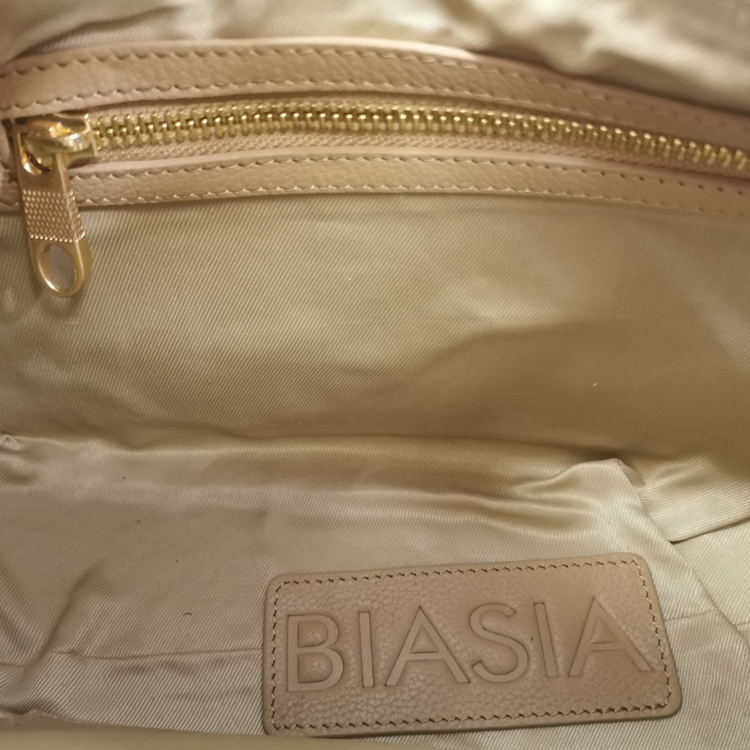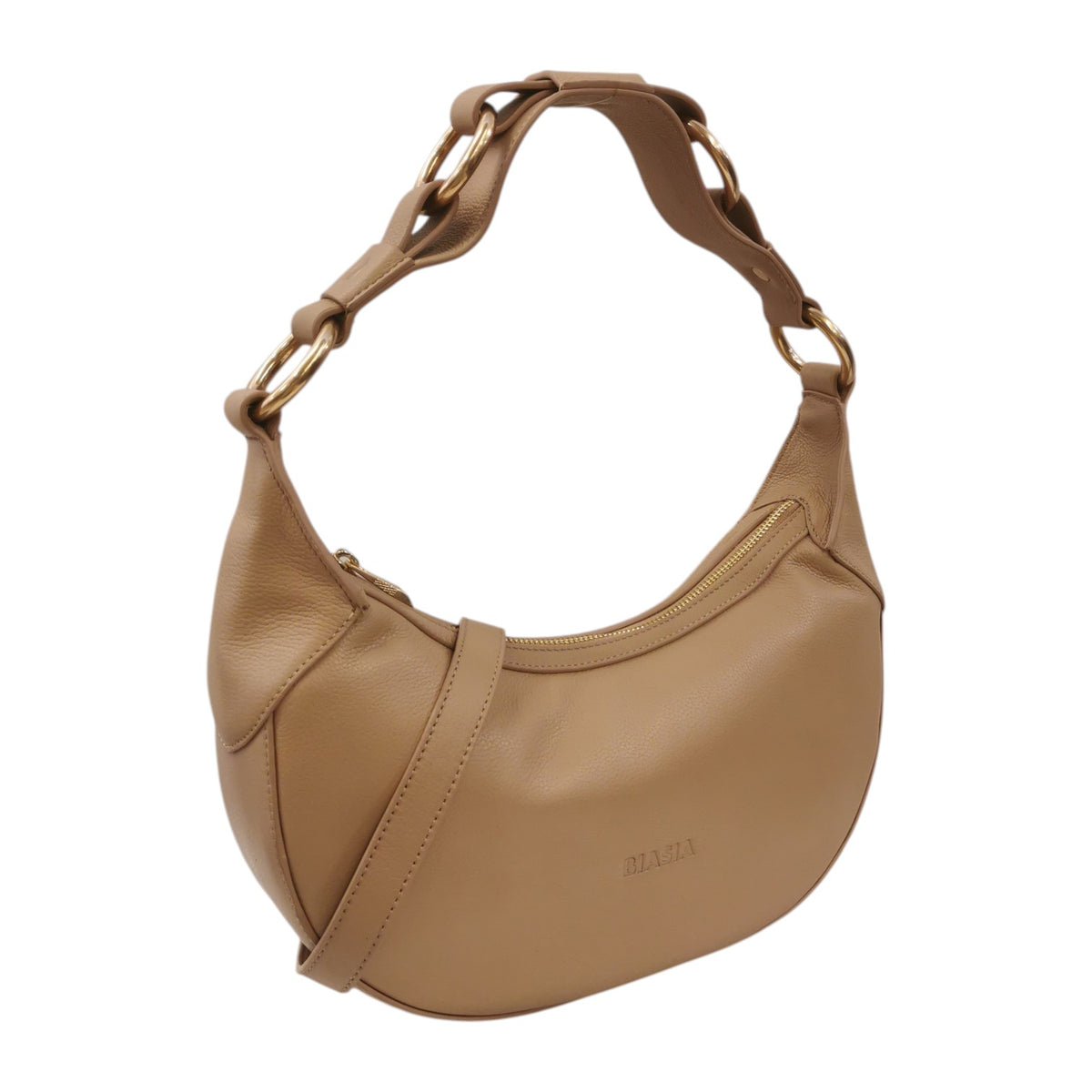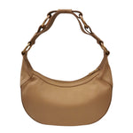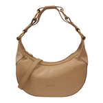 La Borsa a spalla firmata Biasia, modello mezzaluna realizzata in pelle qui proposta nella variante naturale è caratterizzata da inserti dorati con anelli sul manico e da tracolla regolabile e removibile, l'interno è foderato in tessuto con taschino con zip. Ideale per le giornate dinamiche, bilancia struttura e flessibilità.