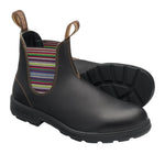 Beatles firmato Blundstone, si distingue per il design classico e il tocco di glamour dato dagli elastici a righe colorate, realizzato in pelle liscia marrone scuro resistente all'acqua. Dotato di linguetta frontale e posteriore per una calzata facile, suola in gomma dentata antiscivolo con tallone rialzato.