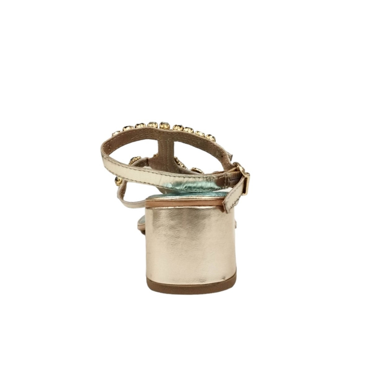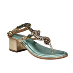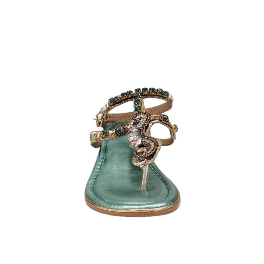 Il Sandalo firmato Bottega Smeralda, realizzato in pelle combinazione di verde e oro presenta una bellissima decorazione a forma di cavalluccio marino tempestato di micro strass. La chiusura universale e classica sopra la caviglia, sotto forma di fibbia, permette di adattare facilmente la larghezza della cintura alla larghezza dei piede.