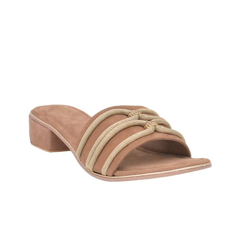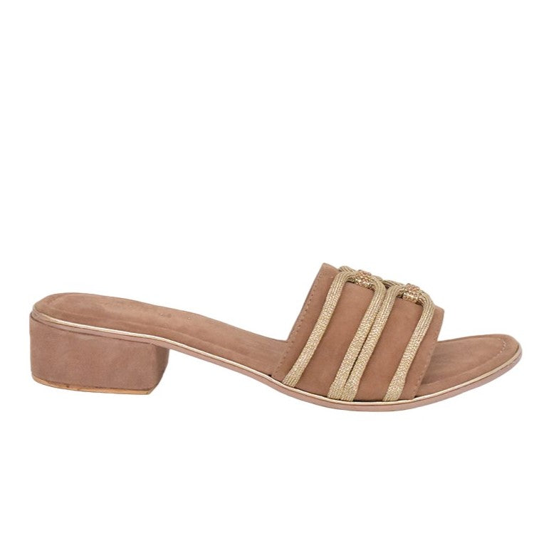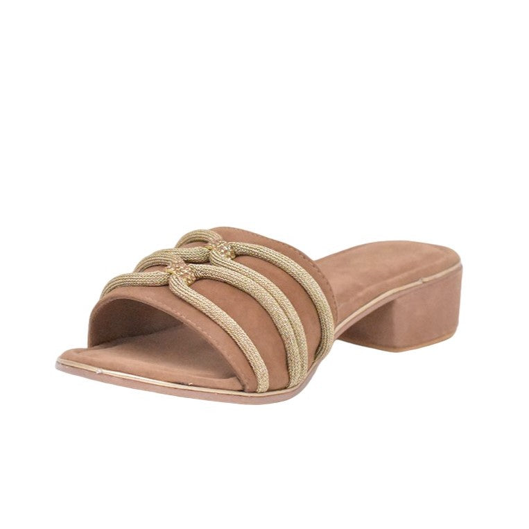 La Ciabatta firmata Bottega Smeralda, caratterizzata da una lussuosa soletta e tomaia in pelle scamosciata presenta un'accattivante tomaia impreziosita da Crystal Rope e un tacco largo alto 3cm.
