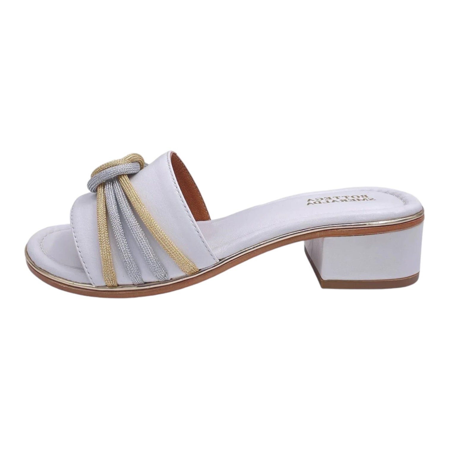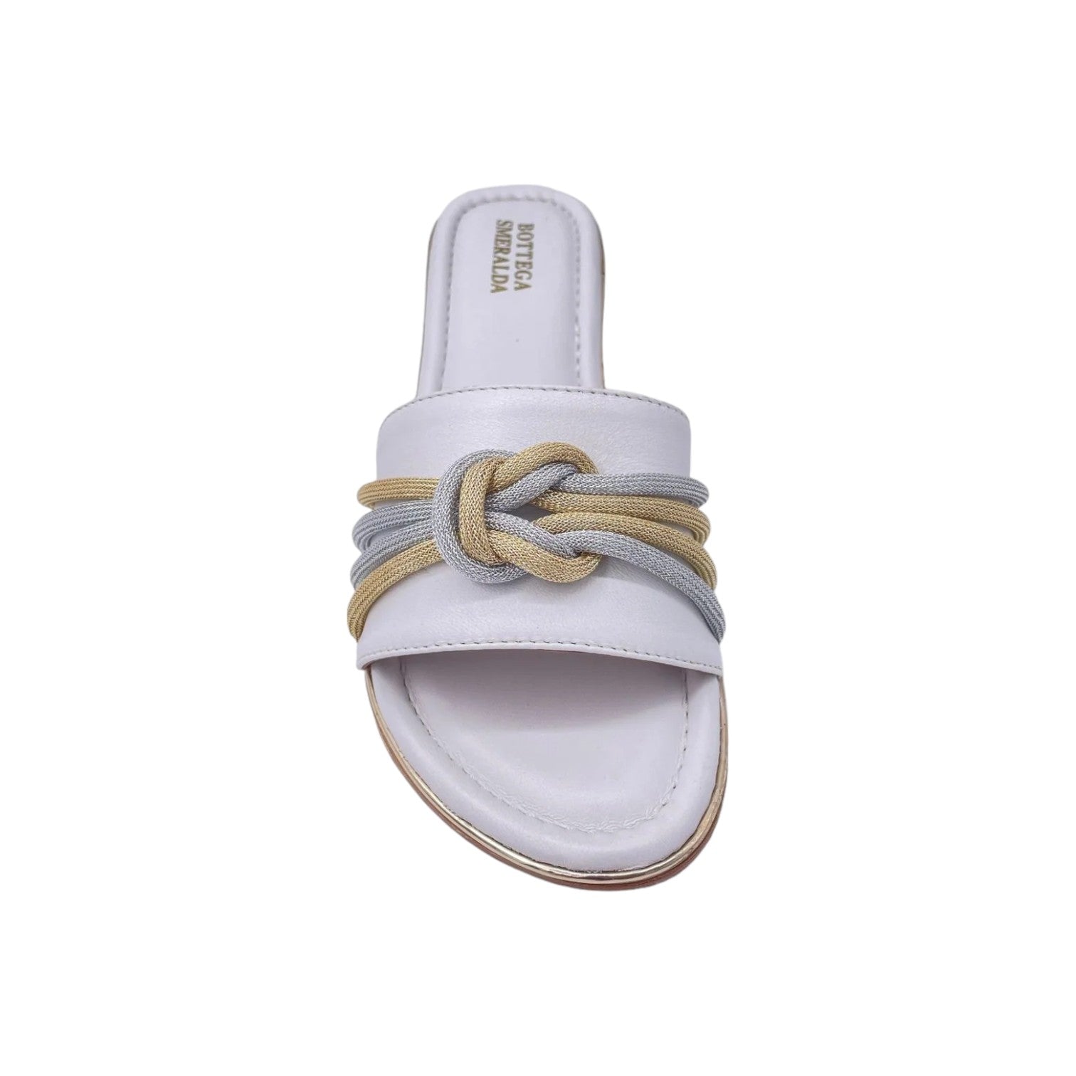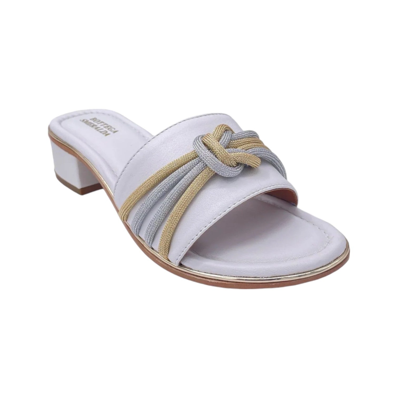 Lo Scalzato firmata Bottega Smeralda, realizzato in pelle bianca è caratterizzato da una lussuosa soletta imbottita in pelle e da un'accattivante fascia sul davanti con nodo impreziosita da Crystal Rope con un tacco largo alto 4cm.