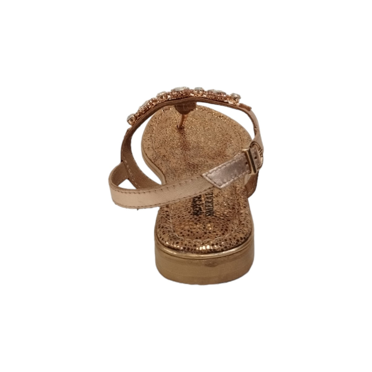 L'Infradito firmato Bottega Smeralda, realizzato in pelle laminata rame è caratterizzato da pietre gioiello e da una soletta imbottita in pelle con comoda chiusura universale e classica sotto forma di fibbia, permette di adattare facilmente la larghezza della cintura alla larghezza dei piede.