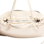 La Borsa a mano firmata By Byblos, dalla forma morbida realizzata in ecopelle avorio è caratterizzata da catena argento e da tracolla regolabile e removibile, presenta l'interno è foderato in tessuto di cui dispone di una tasca con zip e due aperte, e dei laccetti laterali.