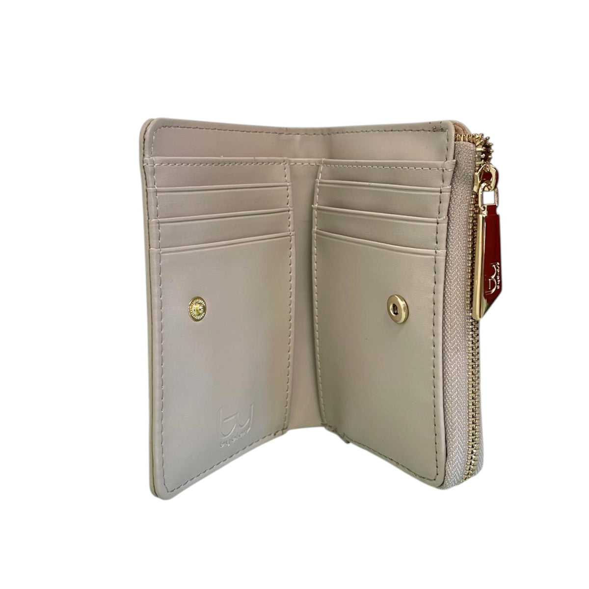 Il Portafoglio firmato By Byblos, realizzato in ecopelle effetto saffiano qui proposto nella variante beige è caratterizzato da uno scomparto per banconote e una tasca laterale con chiusura a zip per monete, 6 slots per carte credito e tessere.