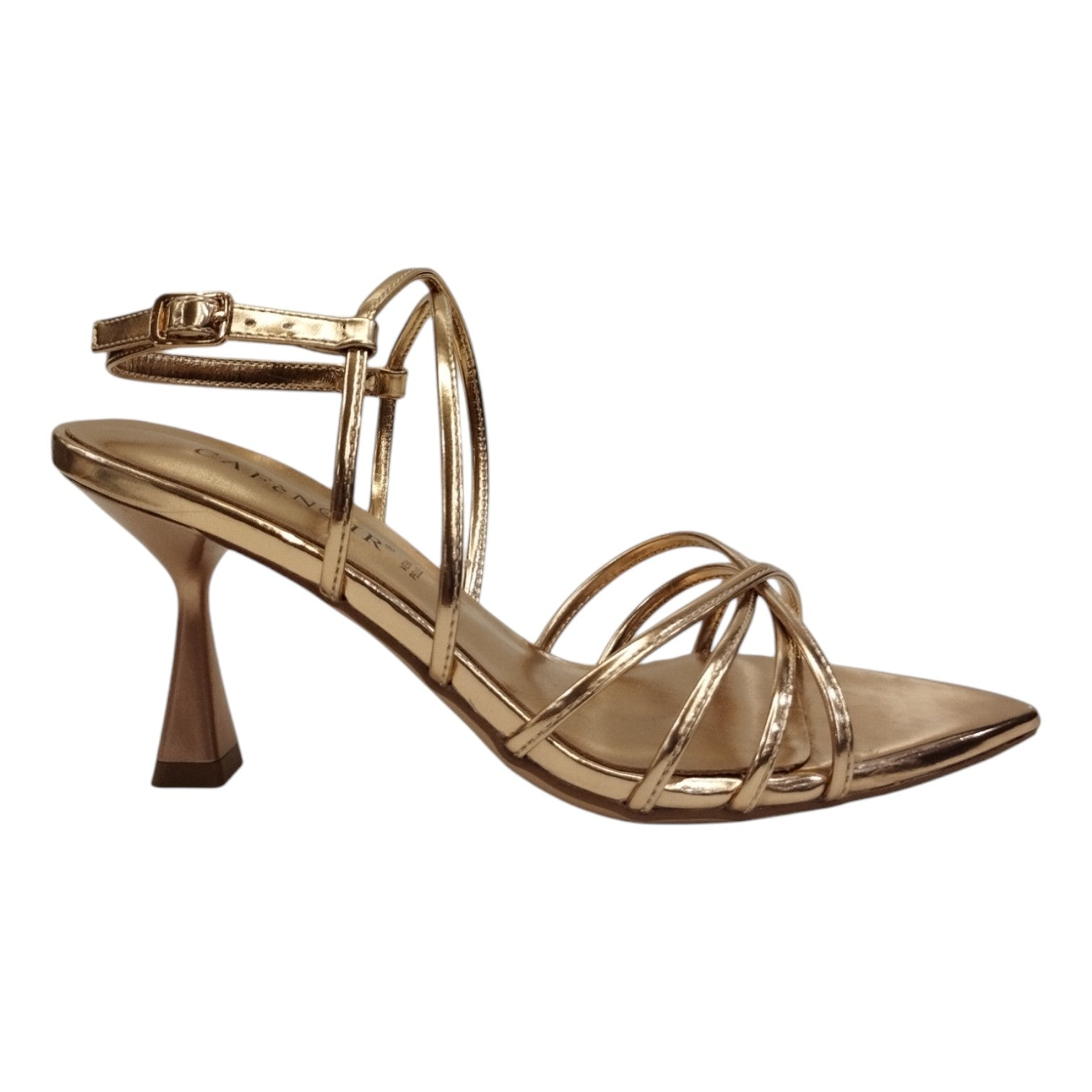 Il Sandalo firmato Cafènoir, realizzato in ecopelle effetto laminato è caratterizzato da multi listini incrociati e da sottopiede foderato in pelle. Dalla forma sfilata questa calzatura ti regalerà un tocco di eleganza e glamour con tacco a rocchetto alto 7cm.