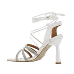 Sandali alla schiava con punta squadrata tacco 115 mm, microstrass su listini davanti, soletto e fodera in pelle. Adatto per rimanere comodi e cool con un gioiello al piede.