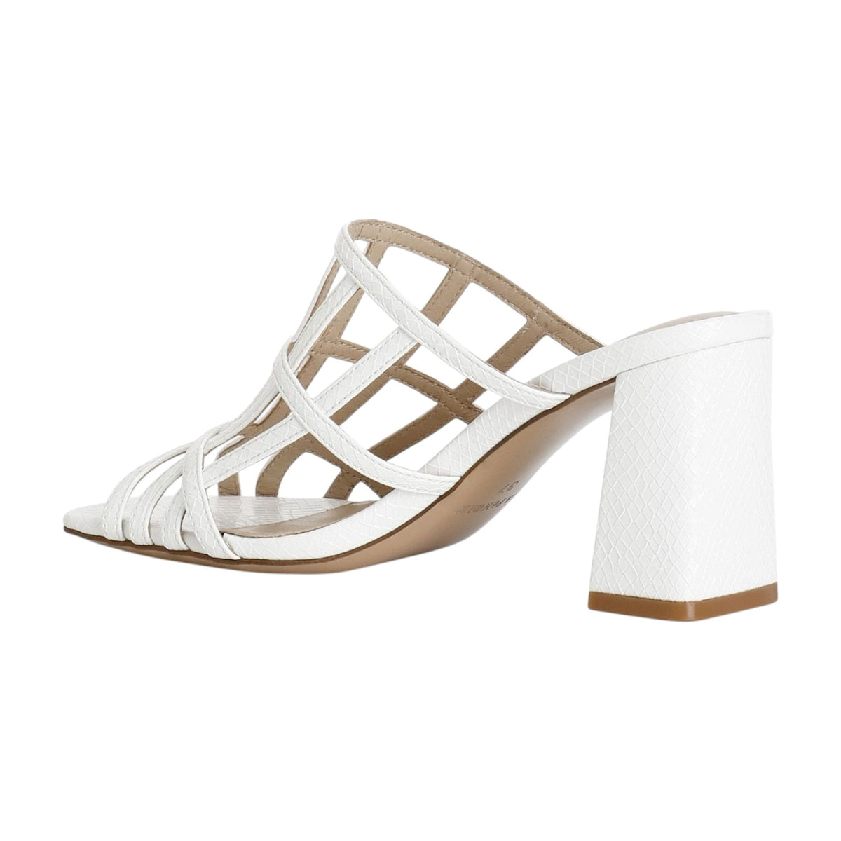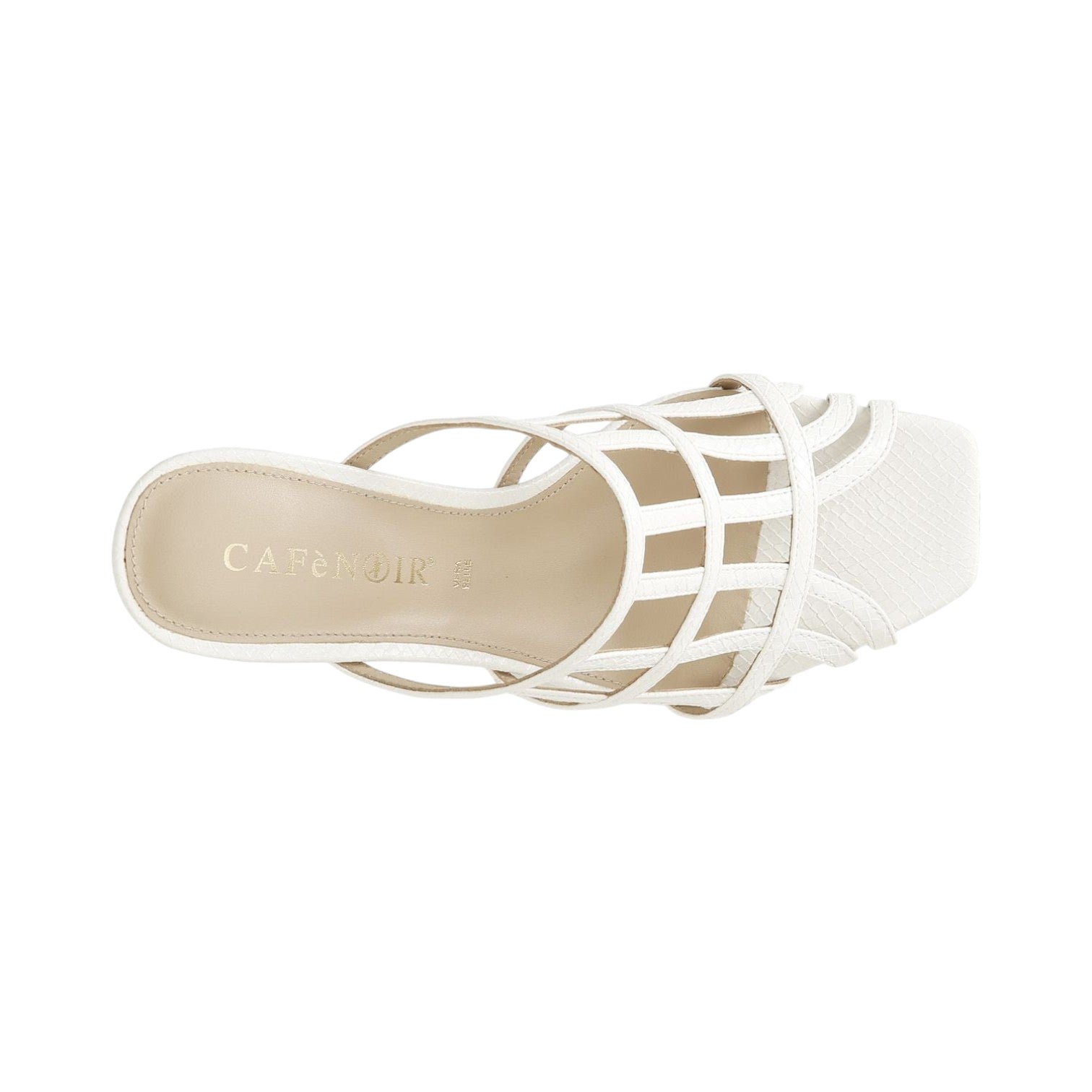 Lo Scalzato firmato Cafènoir, realizzato in pelle nella variante bianca è caratterizzato da particolare tomaia a gabbia effetto stampato e da fodera e plantare rivestiti in pelle. Presenta un tacco largo alto 9cm, calzatura elegante con stile e formale.