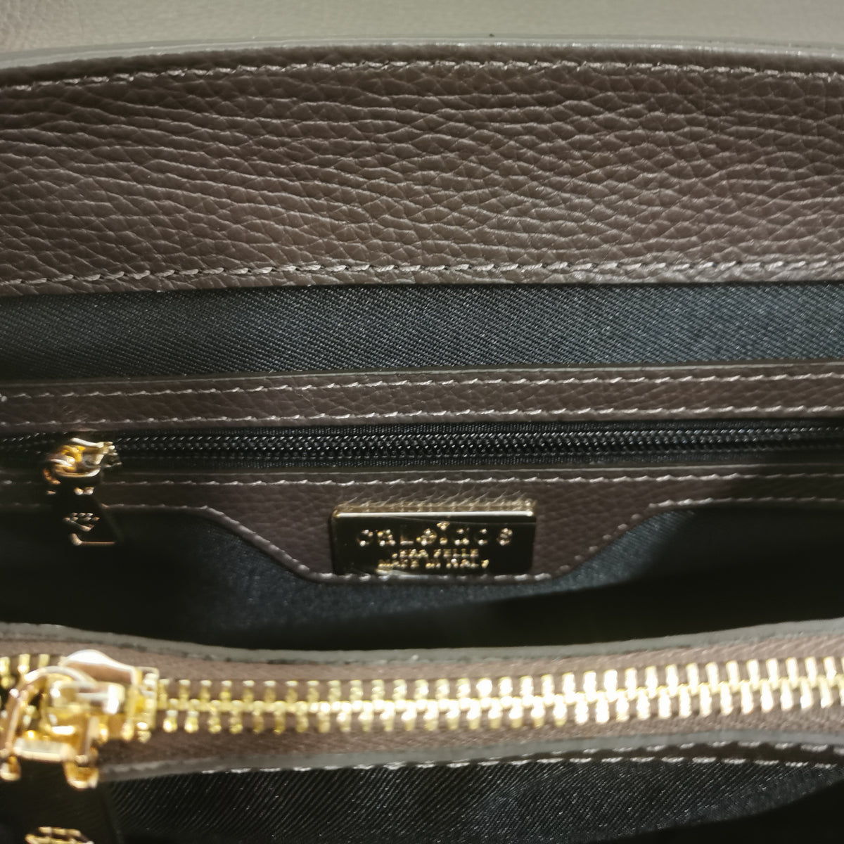 La Borsa a mano firmata Caleidos, realizzata in vera pelle qui proposta nella variante marrone multi è caratterizzata da comoda tracolla regolabile e removibile per portarla a spalla e da contrasti di colore, l'interno è suddiviso in doppio scomparto di cui quello centrale chiuso con zip. Un accessorio indispensabile per chi cerca design raffinato e praticità quotidiana.