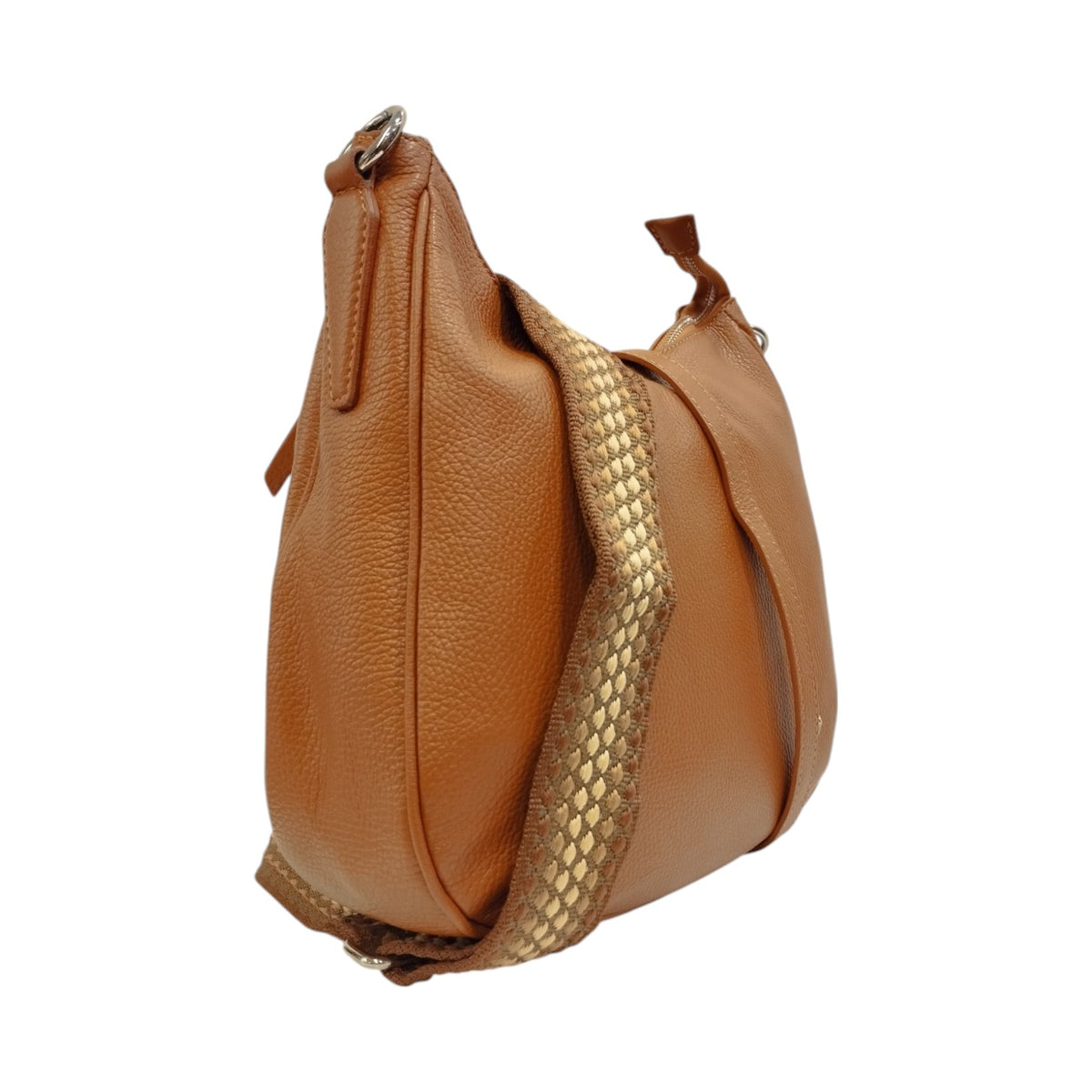 La Borsa a spalla firmata Caleidos, realizzata in pelle martellata color cuoio è caratterizzata da doppia tracolla regolabile e removibile una in tessuto ed una in pelle, presenta l'interno foderato in tessuto con tasca chiusa a zip. Con dettagli curati e una struttura spaziosa, è l'accessorio ideale per chi cerca un tocco di classe e funzionalità.