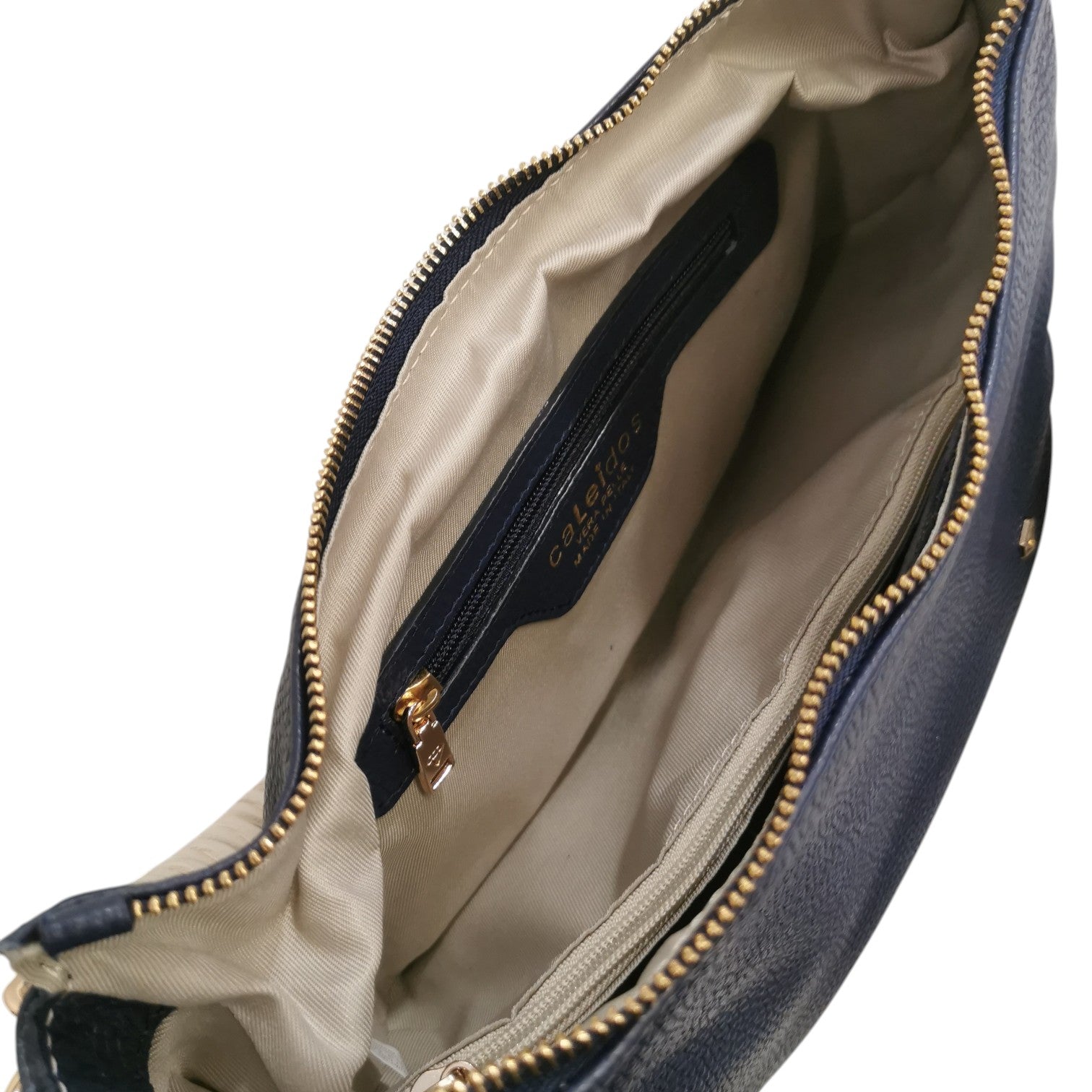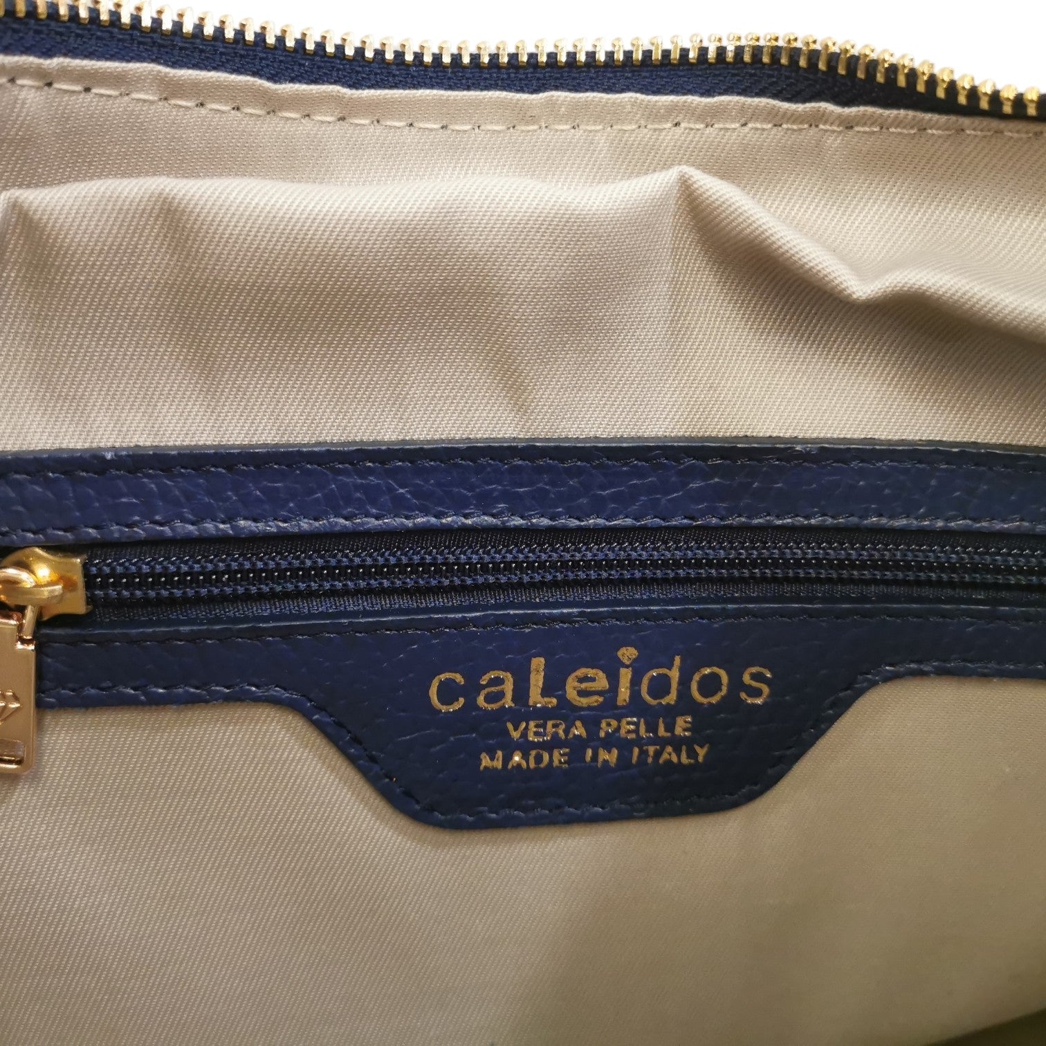 La Borsa a spalla firmata Caleidos, realizzata in vera pelle qui proposta nella variante blu è caratterizzata da inserti color beige e da comodo manico intrecciato removibile per portarla a spalla. È dotata di tasca sul retro con chiusura a zip e di una tracolla regolabile e removibile, per un comfort personalizzabile e uno stile versatile. L'interno è foderato in tessuto di cui è suddiviso in doppio scomparto e quello centrale chiuso con zip.