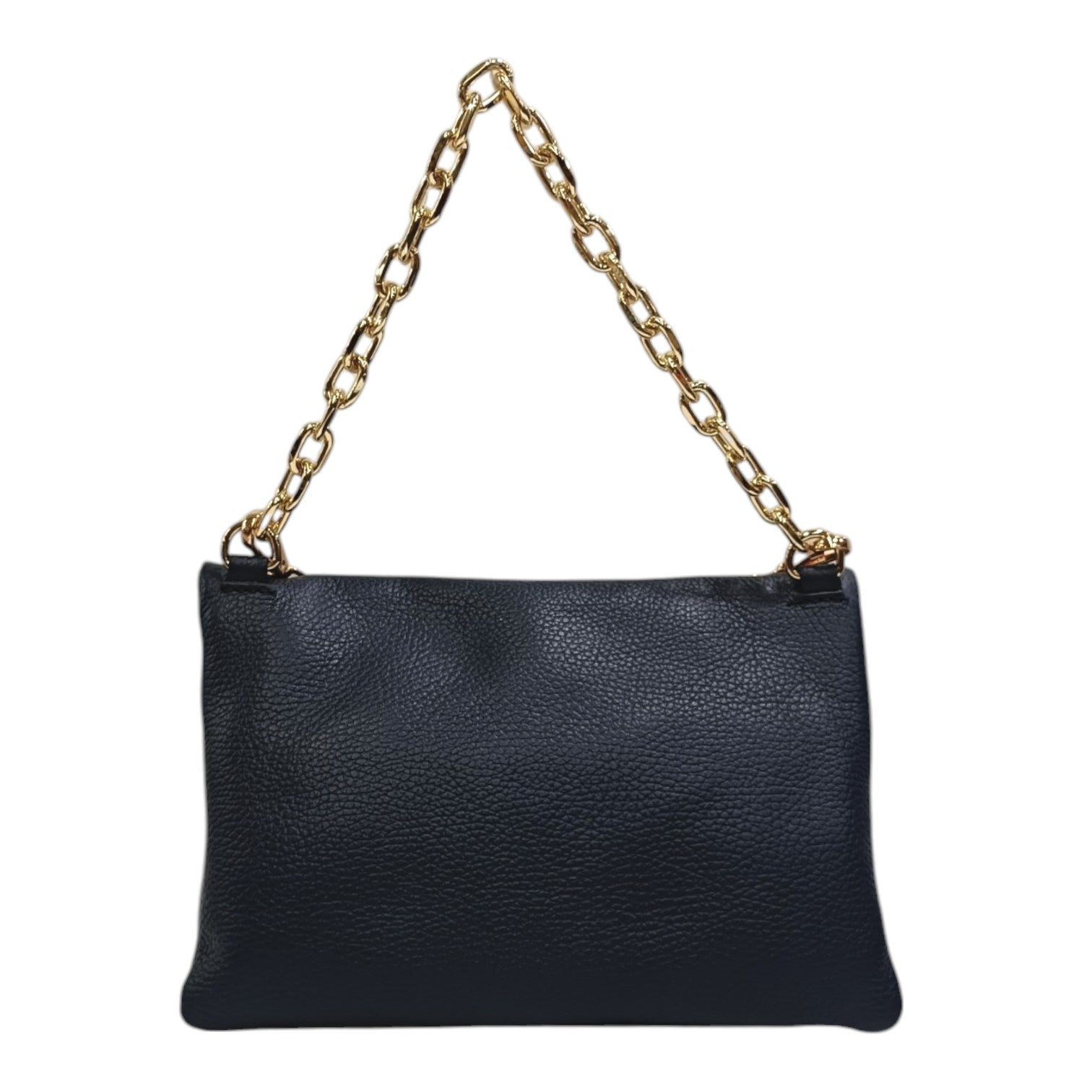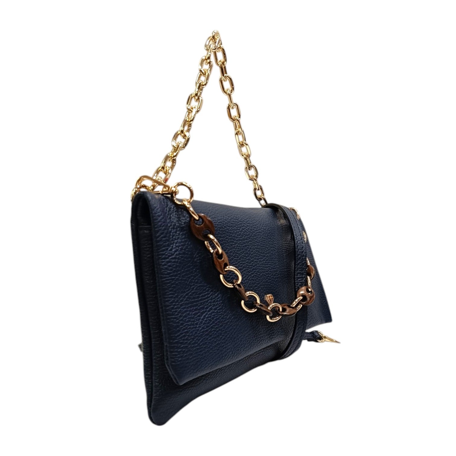 La Borsetta a spalla firmata Caleidos, realizzata in pelle martellata qui proposta nella variante blu è caratterizzata da doppia catena removibile sia da usare come decorazione che come manico con tracolla in pelle. L'interno è foderato in tessuto di cui dispone di tasca con zip.