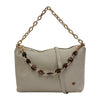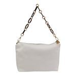 La Borsa a spalla firmata Caleidos, realizzata in pelle martellata qui proposta nella variante bianca è caratterizzata da doppia catena removibile sia da usare come decorazione che come manico con tracolla in pelle. L'interno è foderato in tessuto di cui dispone di tasca con zip.