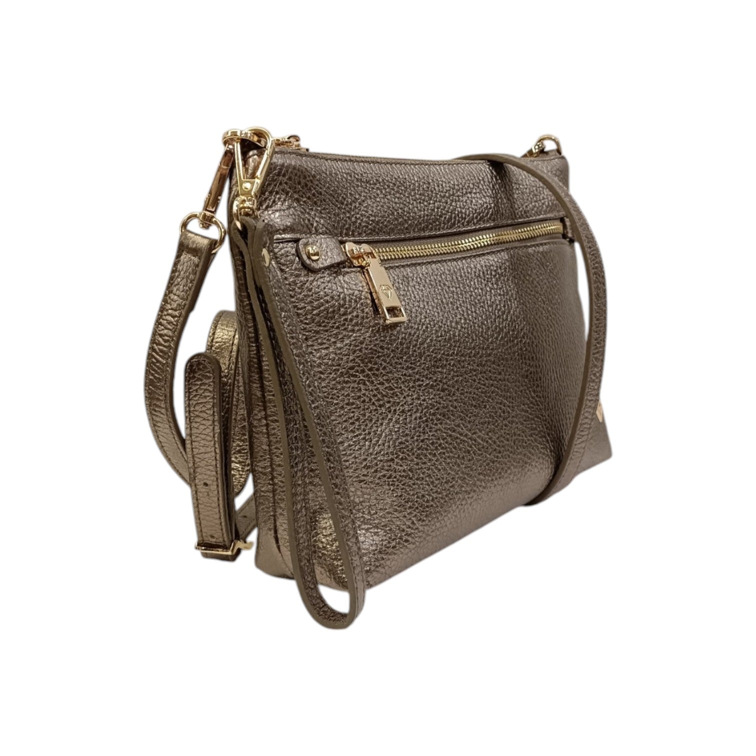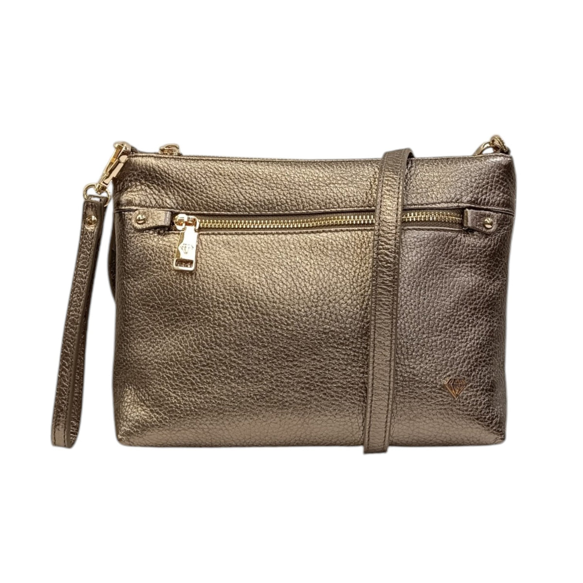 La Pochette firmata Caleidos, realizzata in pelle martellata qui proposta nella variante bronzo è caratterizzata da tasca frontale con zip e da tracolla regolabile e removibile. L'interno è foderato in tessuto di taschini tra cui uno chiuso con zip.