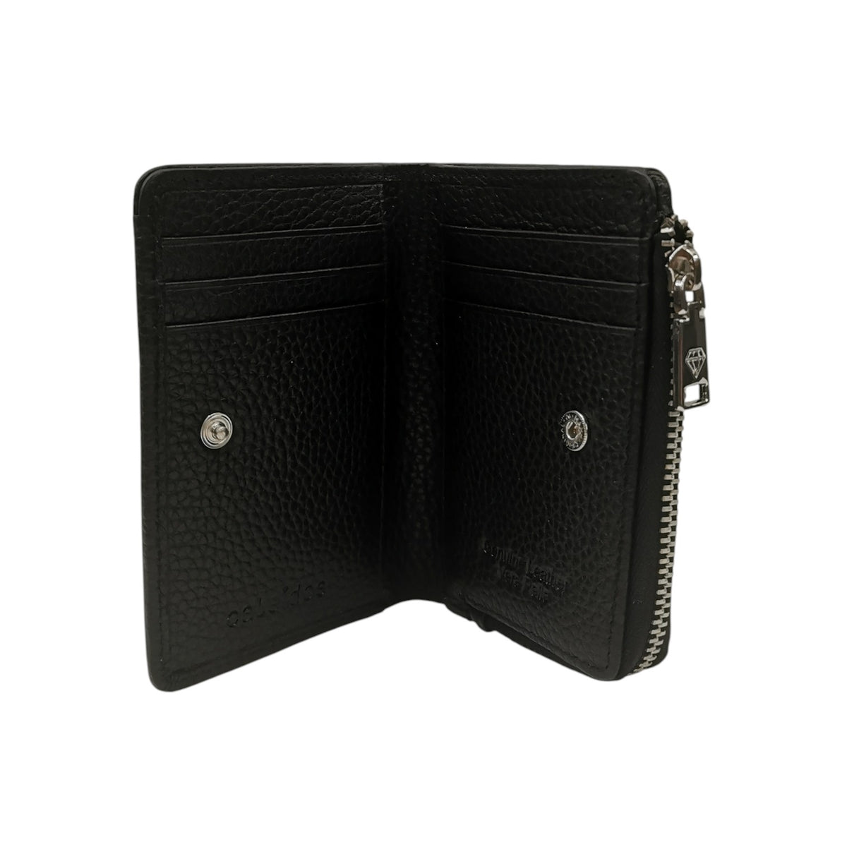 Il Portafoglio firmato Caleidos, realizzato in vera pelle martellata qui proposto nella variante nera, è caratterizzato da scomparto per le monete con zip, si apre a libro con una chiusura con bottone magnetico di cui presenta 6 scomparti per le tessere e banconote.