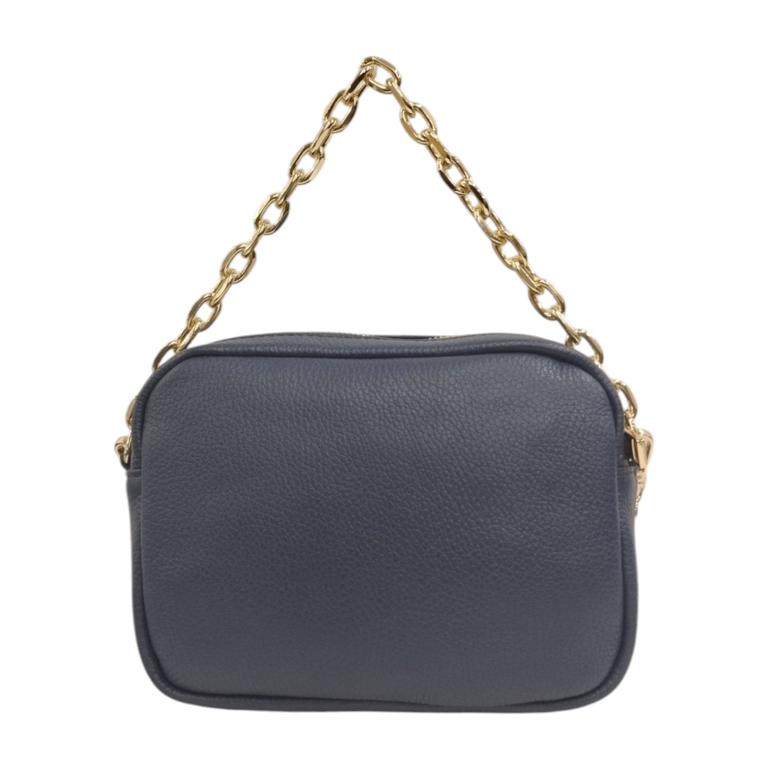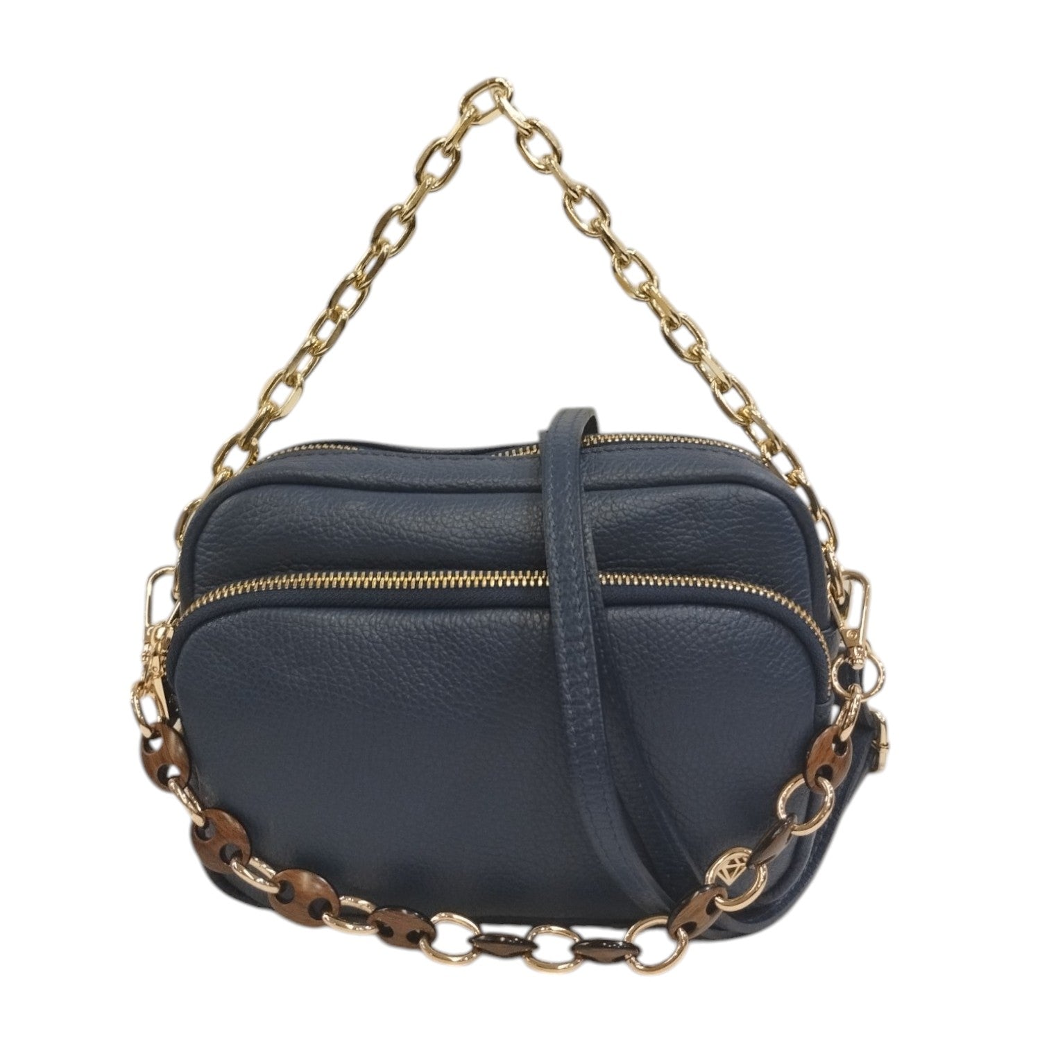 La Tracolla firmata Caleidos, realizzata in morbida pelle martellata qui proposta nella variante blu è caratterizzata da doppia catena removibile da usare come manico o come decorazione e da tracollina regolabile e removibile. Presenta un doppio scomparto foderato in tessuto di cui dispone di taschino con zip.