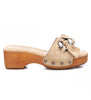 Lo Scalzato firmato Carmela, realizzato in pelle crosta, design tipo mulo con catena metallica intrecciata con fiocco in camoscio, chiodini laterali metal su zeppa in legno.